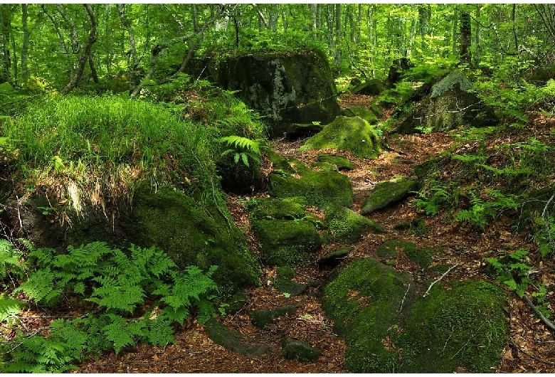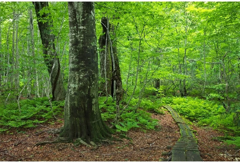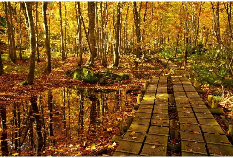 「白神山地(岳岱自然観察教育林)(だけだいしぜんかんさつきょういくりん)」は、世界自然遺産である白神山地の原生林の雰囲気を気軽に味わえる森です。敷地内には、苔がむした巨石やブナの巨木、モリアオガエルの池などの見どころを多く有しています。紅葉は例年10月上旬に色づき始め、10月下旬に見頃を迎えるため、整備された遊歩道から色鮮やかな景色を眺めながらトレッキングを満喫しましょう。