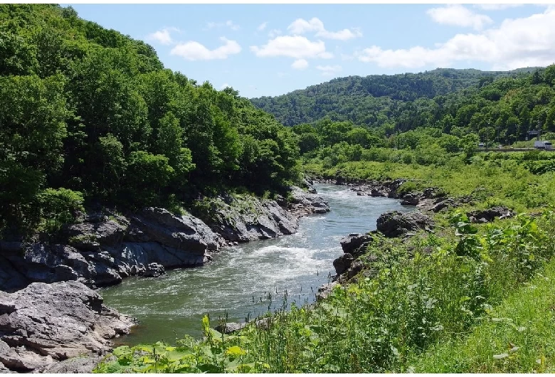 石狩川の急流に位置する景勝地 で、地名の由来はアイヌ語で「神が住む場所」という意味。 パワースポット としても知られています。美しい渓谷やつり橋があり、 春は桜、秋は紅葉と、四季折々の自然 を楽しめる場所です。