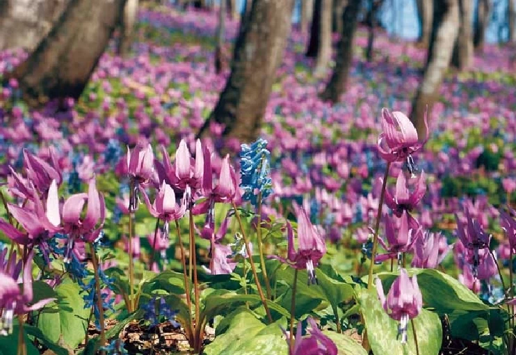 丘陵地に広がる約32ヘクタールの園内では、 可憐なカタクリをはじめ、エゾエンゴサク、イチゲ、フクジュソウなど、春の花々が次々と咲き誇り 、訪れる人の目を楽しませてくれます。