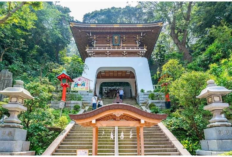 「江島神社」は、愛犬と同伴でお参りできる神社です。辺津宮、中津宮、奥津宮の三社からなり、古くから縁結びのご利益があるといわれています。カラビナがついた愛犬用のお守りも頒布されており、大切な家族の無病息災をお祈りできます。キャリーバッグを持参すれば、屋外エスカレーター「江の島エスカー」での移動も可能です。