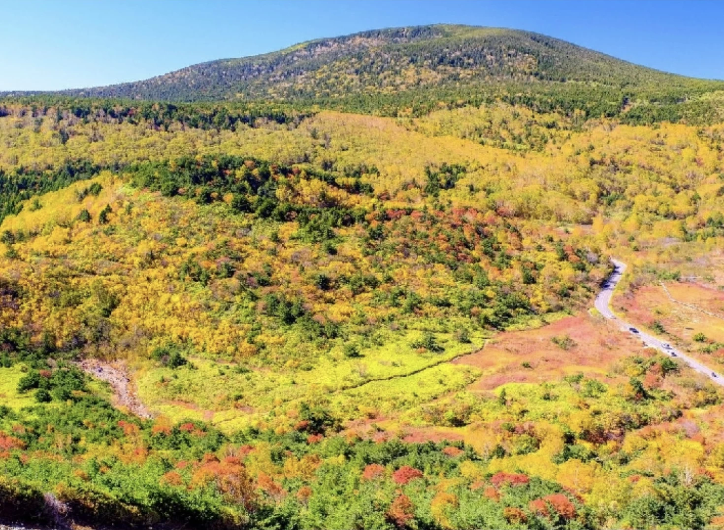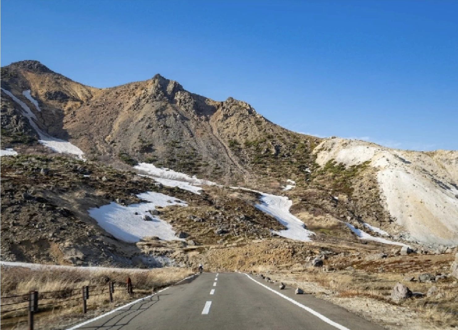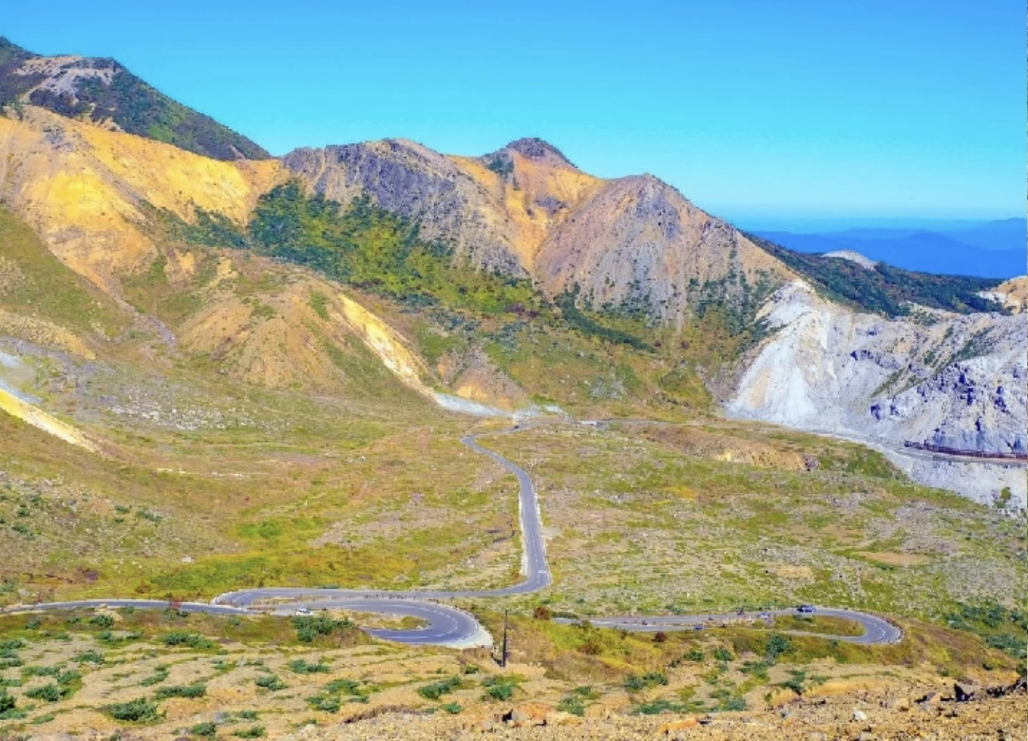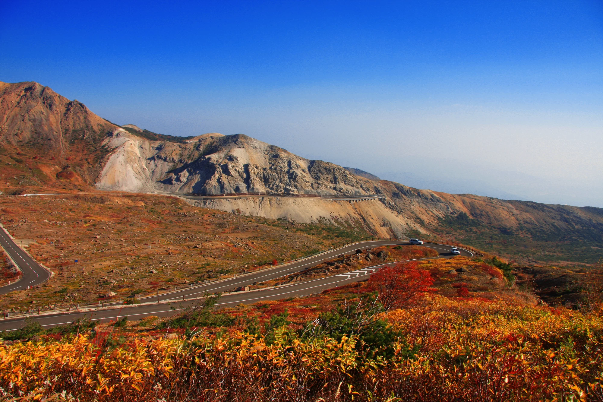 「磐梯吾妻スカイライン(浄土平)」は、全長約29km、最高標約1,600mの高地を走り抜ける山岳観光道路です。周囲には、東吾妻山や吾妻小富士がそびえ、火山活動によって生まれた雄大な景観のなかでドライブできます。周辺では、気軽に立ち寄れる湿原散策や約10分で登れる吾妻小富士の登山など、アクティビティも体験できます。紅葉シーズンには、山肌一面が赤や黄色に染まり、その彩りを間近で望められるのが魅力です。