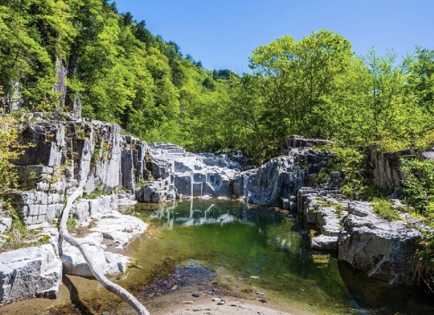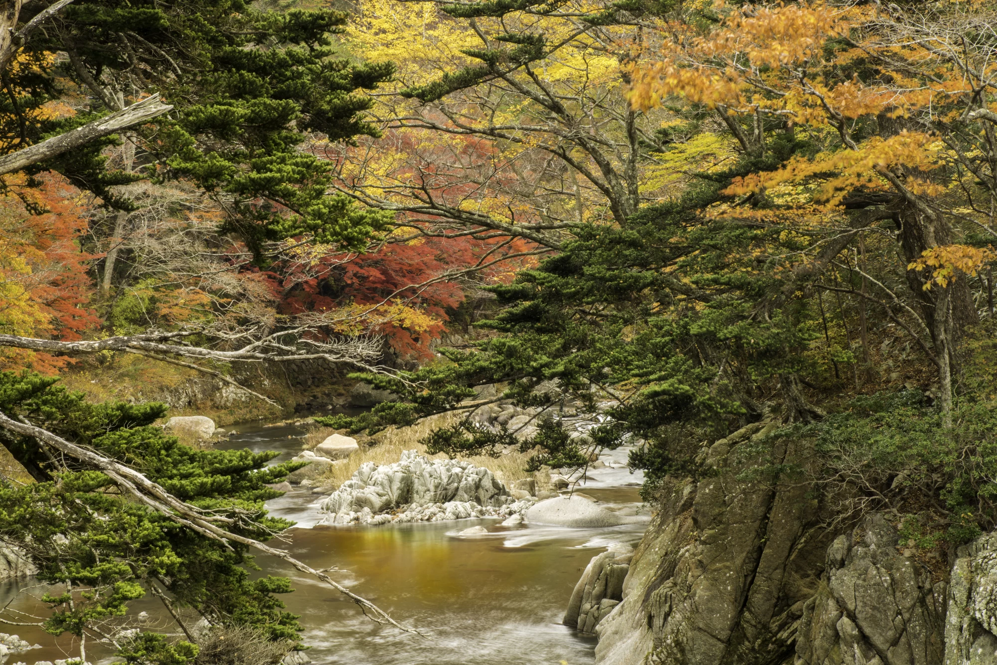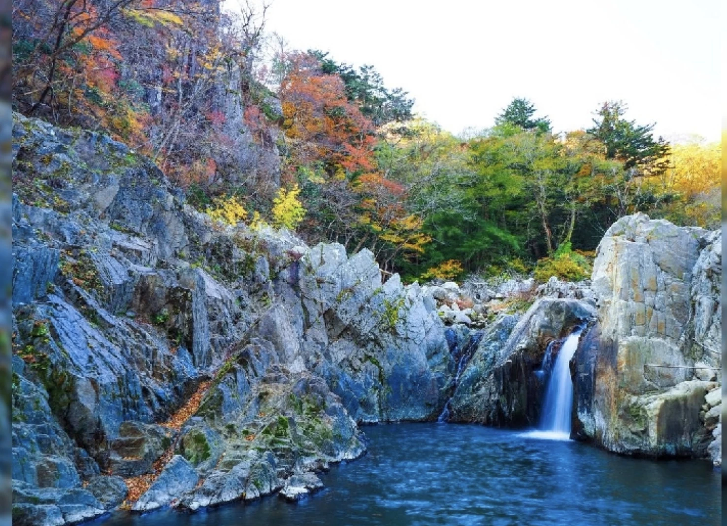 「夏井川渓谷」は、磐越東線川前から小川郷駅にかけて約16kmにわたって続く景勝地です。岩肌を削り取って生まれた断崖や独特の形をした岩、迫力ある滝の音など、渓谷ならではの風景が見どころで、目と耳で大自然を感じられます。紅葉の見頃は10月下旬から11月中旬で、夏には深緑に包まれていた渓谷が赤や黄色に染まり、華やかな姿へと変わります。
