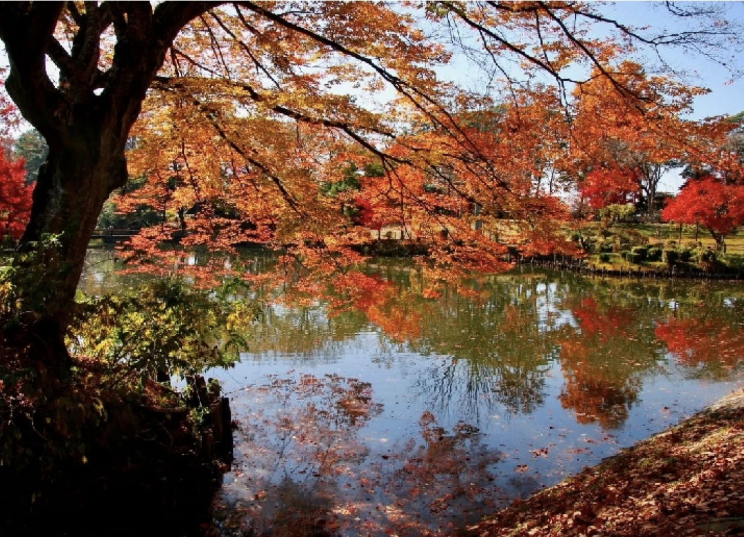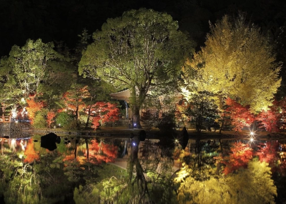 「南湖公園(翠楽苑)」は、武士も庶民も楽しめる行楽地として、1801年に松平定信が築造した公園です。園内は、1周約2kmの南湖を中心に広がり、南湖神社や翠楽苑(すいらくえん)、共楽亭などの松平定信ゆかりの名所が点在しています。紅葉の見頃は例年10月下旬から11月上旬で、この時期には翠楽苑でライトアップされ、幻想的な雰囲気に包まれます。
