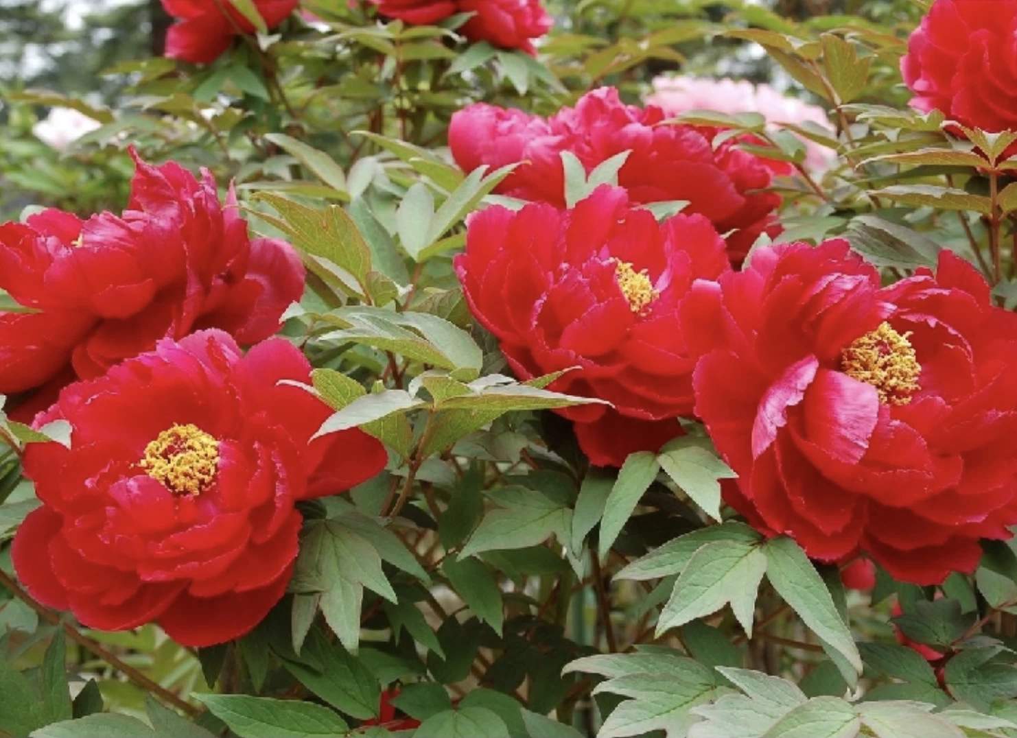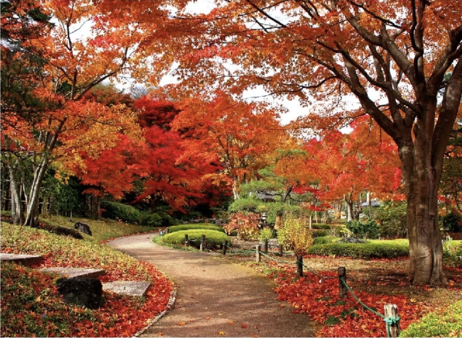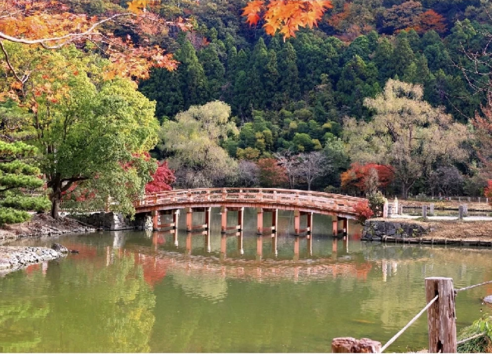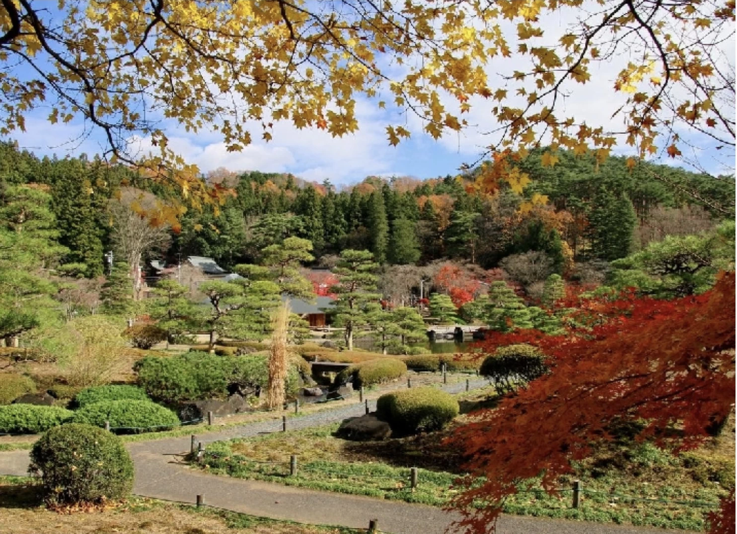 「須賀川牡丹園」は、春には約290種およそ7,000株の牡丹が咲き誇る、国の名勝に指定されている牡丹園です。園内では四季折々の景色が楽しめ、10月下旬から11月上旬にかけては紅葉が見頃を迎えます。この時期には寒牡丹も咲き始め、艶やかに色づいたモミジとともに華やかな秋の景色を演出します。正門近くから大池にかかる花王橋をはじめ、園内の随所で赤く染まったモミジは必見です。
