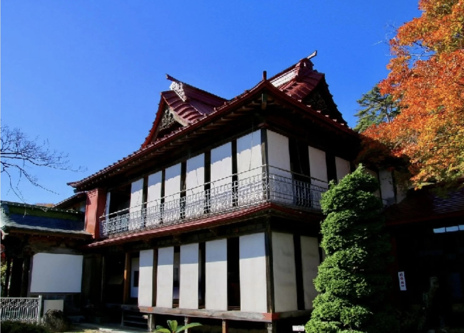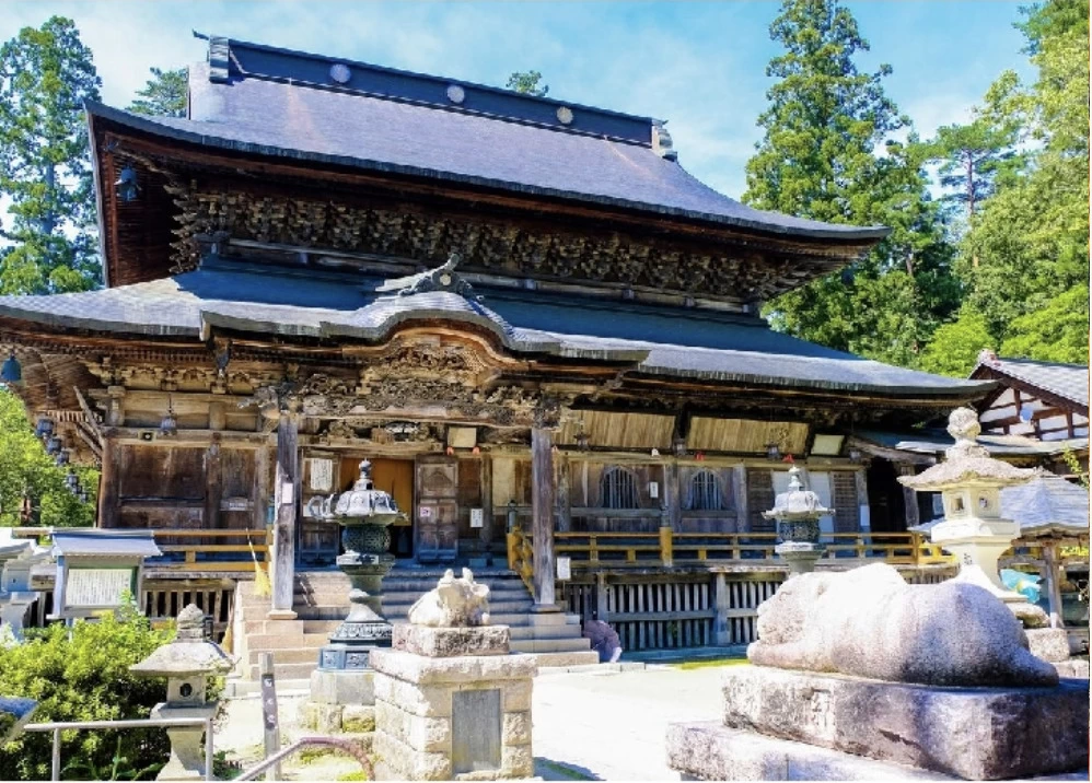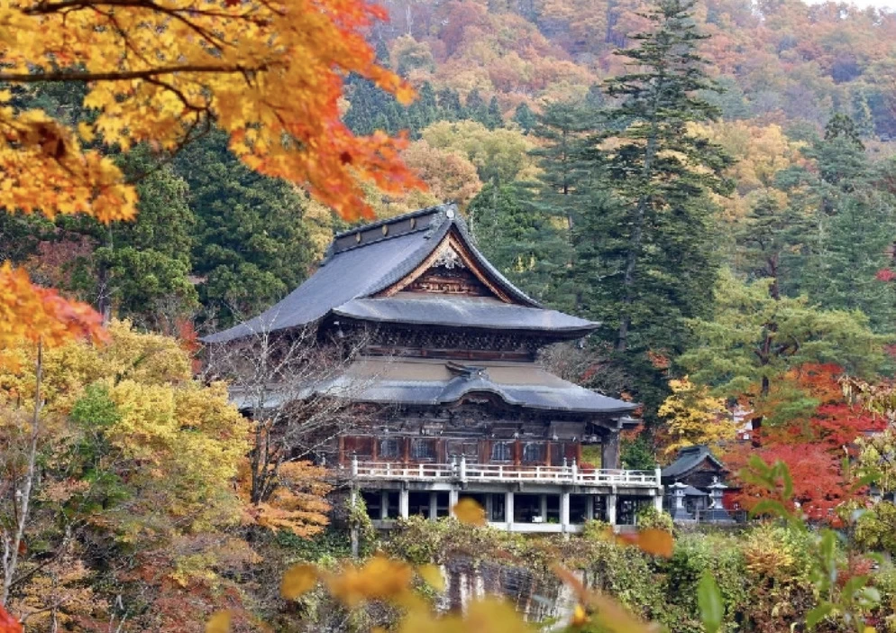 「福満虚空藏菩薩圓藏寺(ふくまんこくうぞうぼさつえんぞうじ)」は、807年に徳一大師が開創したと伝えられる、約1200年の歴史をもつ寺院です。日本三大虚空蔵菩薩のひとつに数えられ、御本尊の福満虚空藏菩薩は弘法大師作とされています。紅葉の名所としても知られており、例年10月下旬から11月上旬の見頃には石段を覆うように真っ赤なモミジが広がり、境内にそびえる虚空蔵堂を背景にした景色は格別です。
