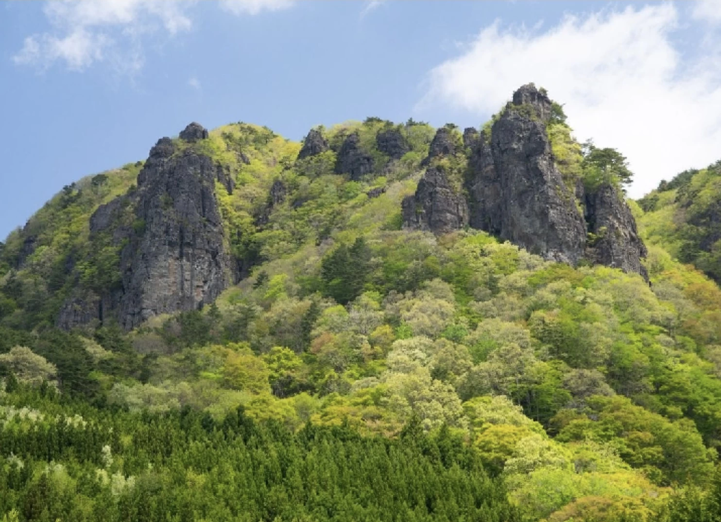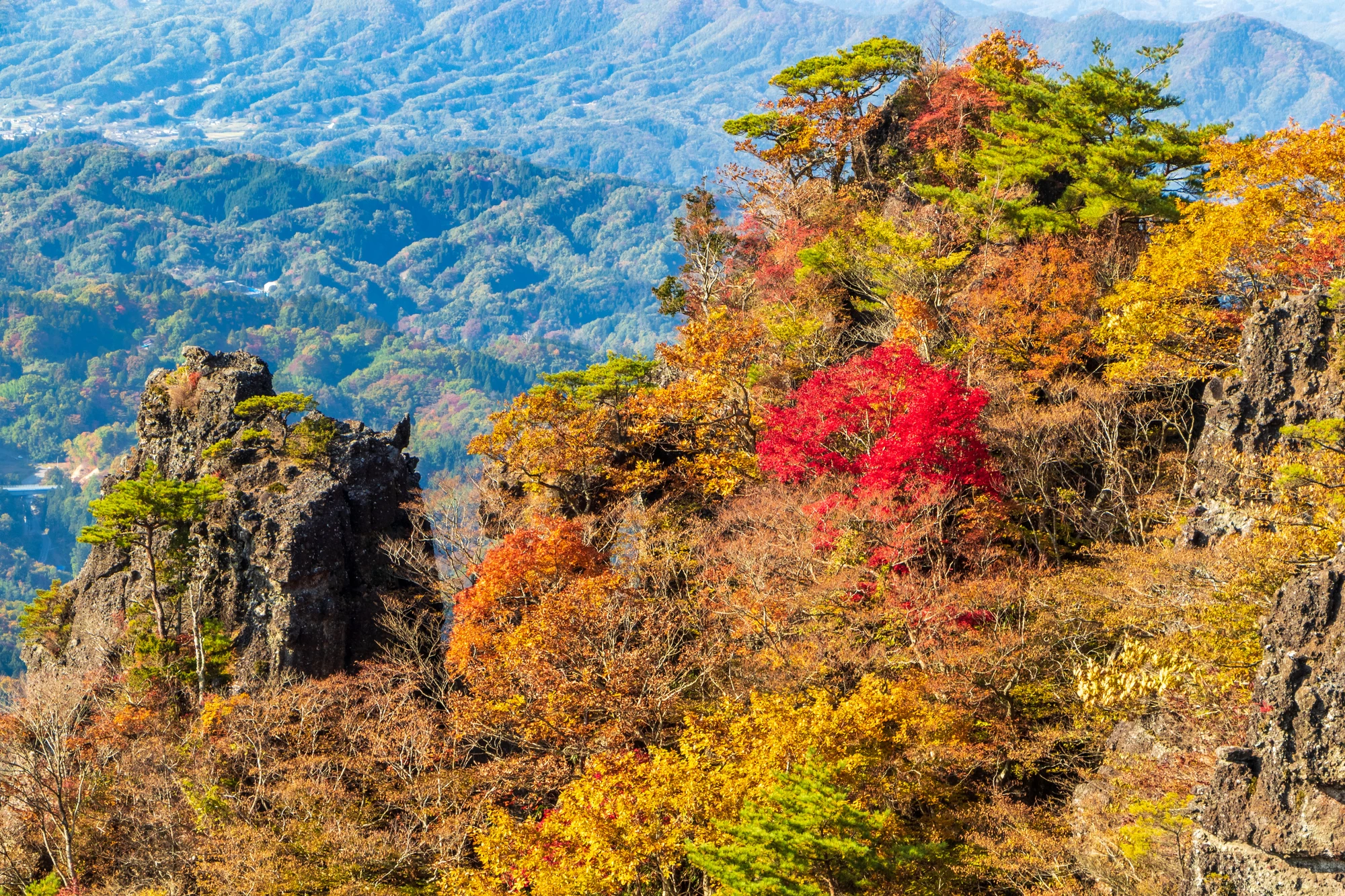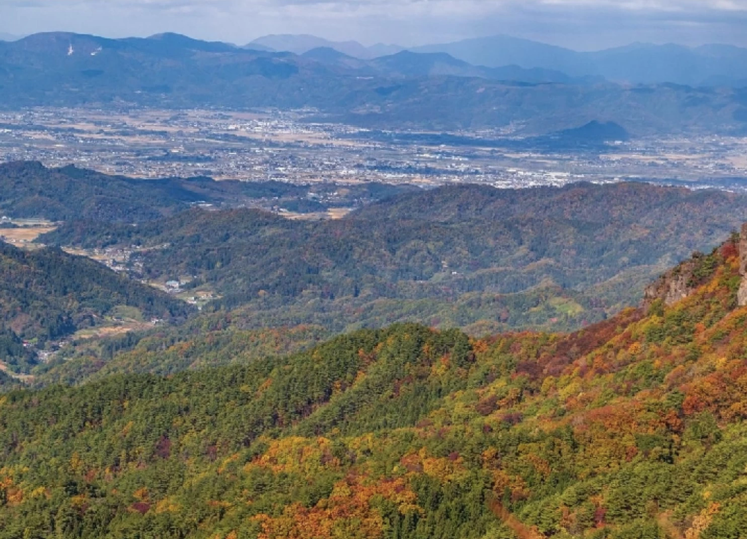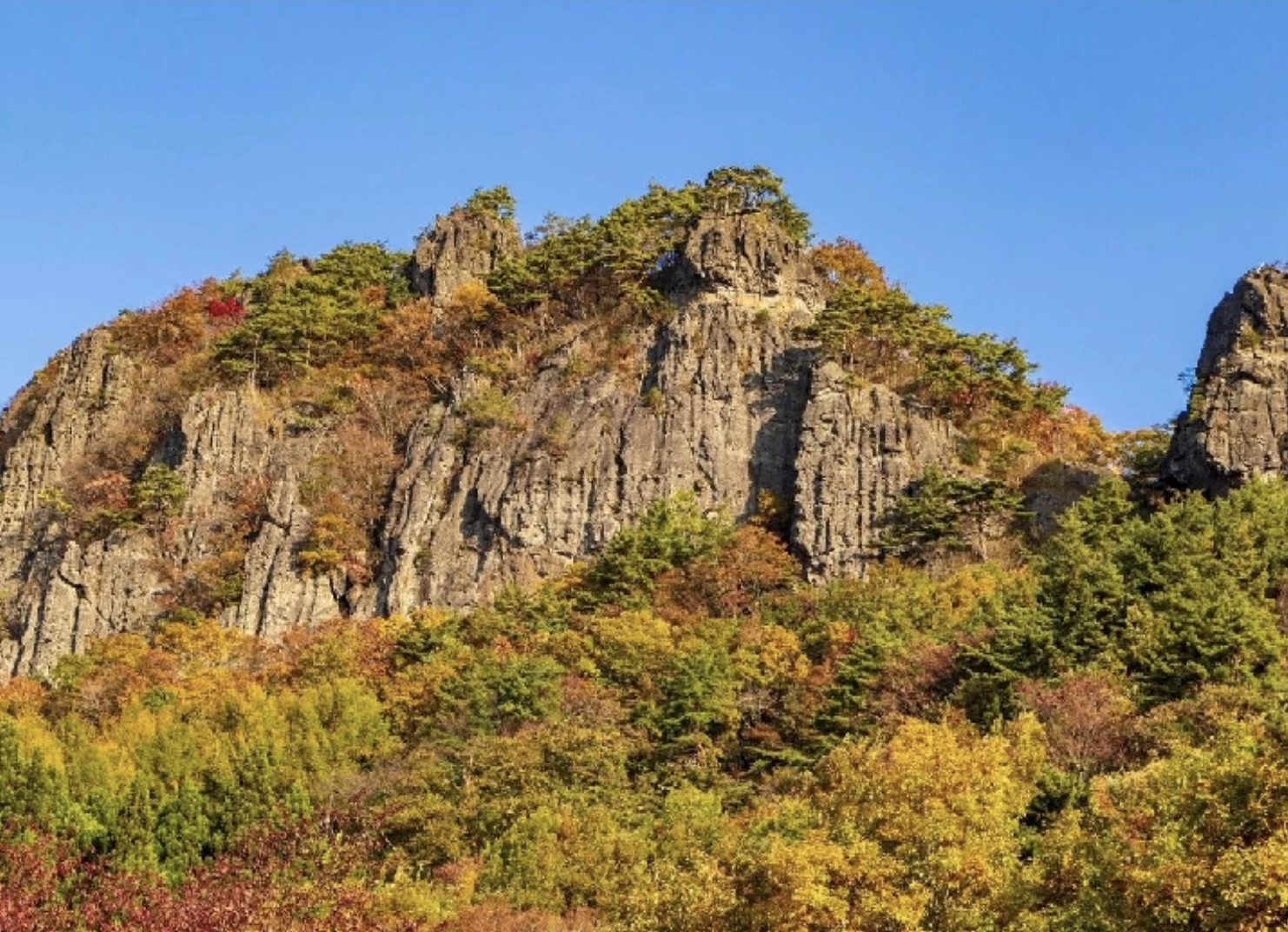 「霊山(りょうざん)」は伊達市のシンボルであり、東北の名峰として知られる山です。山中には整備されたハイキングコースがあり、太平洋を一望できる景色と気軽に楽しめるトレッキングを満喫できます。登山難易度は初級で道も歩きやすく、家族連れでも秋の山歩きを満喫できます。紅葉の見頃は例年10月下旬から11月上旬で、切り立った岩場と赤や黄色に染まった木々が織り成す景色は圧巻です。