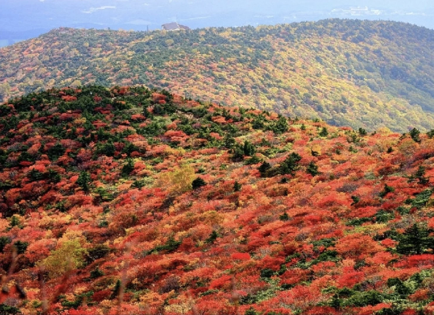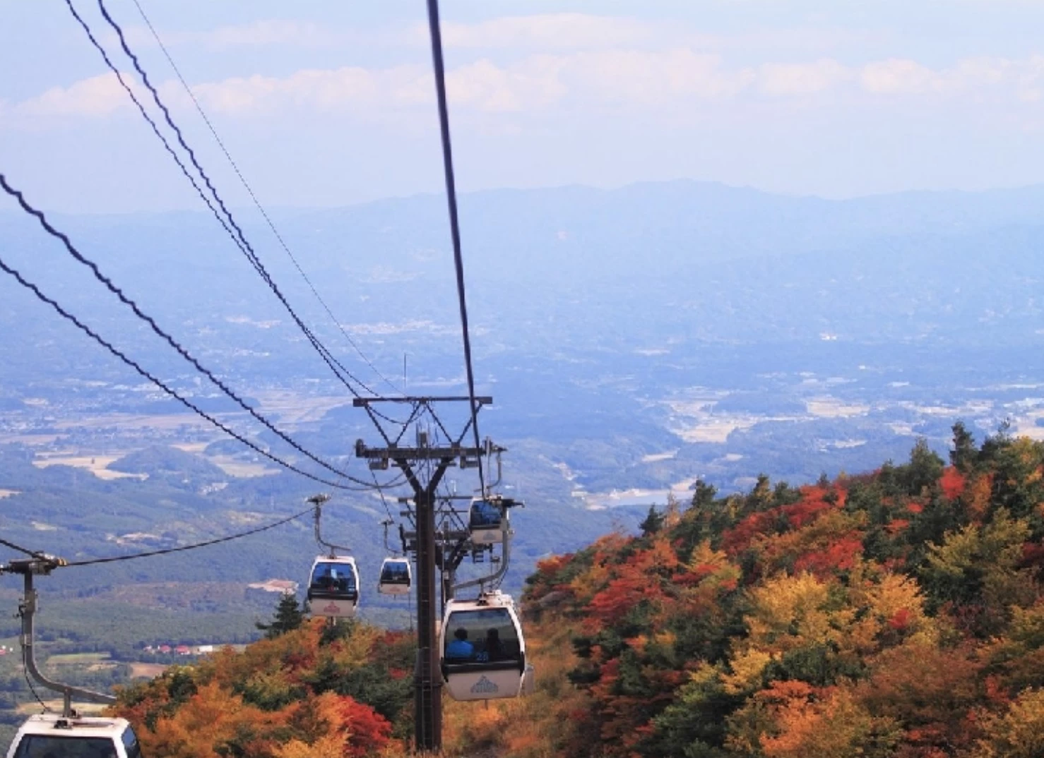 「あだたら山ロープウェイ」は、安達太良山のふもと奥岳登山口から、8合目にあたる薬師岳までの空中散歩を楽しめるゴンドラです。乗車中は安達太良連峰や遠くに吾妻小富士、蔵王連峰を一望できます。紅葉の見頃は例年10月上旬から下旬で、ミズナラやブナ、イタヤカエデ、ナナカマドなどが赤や黄に染まり、秋色のグラデーションが車窓いっぱいに広がります。