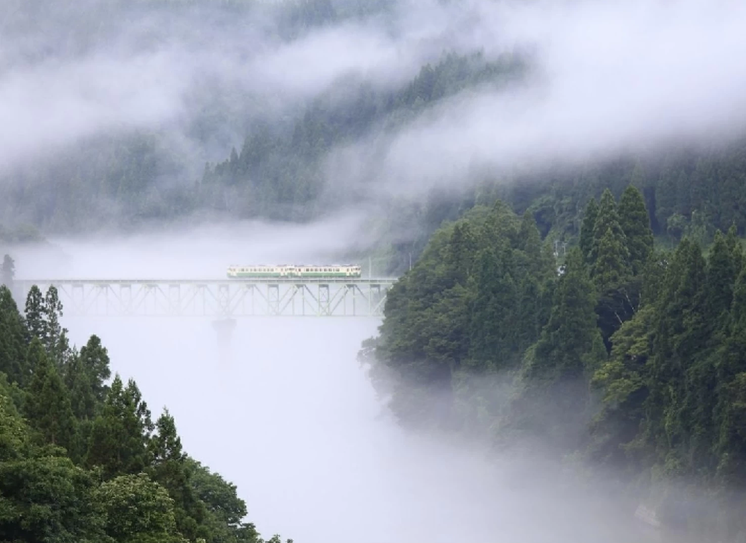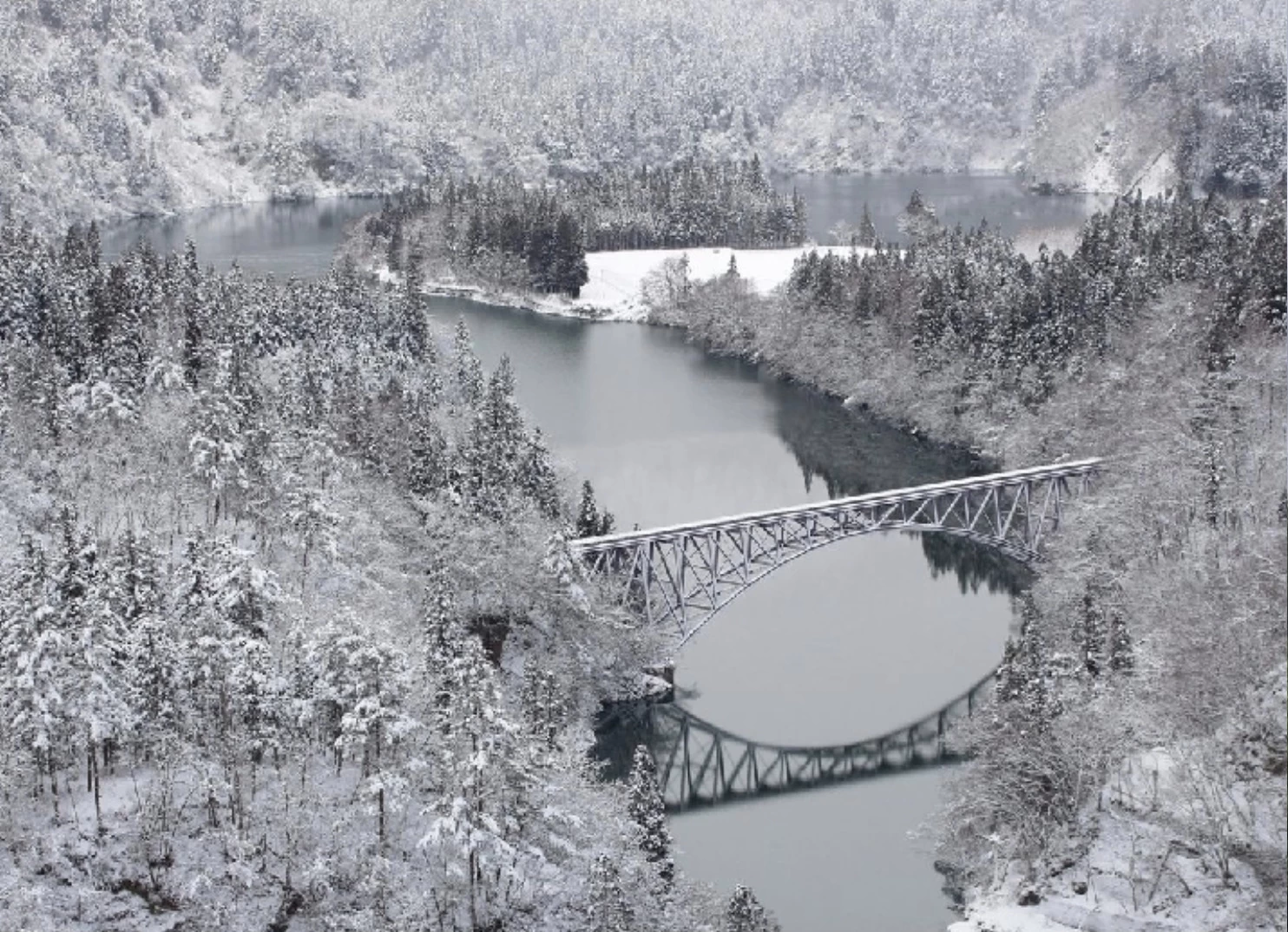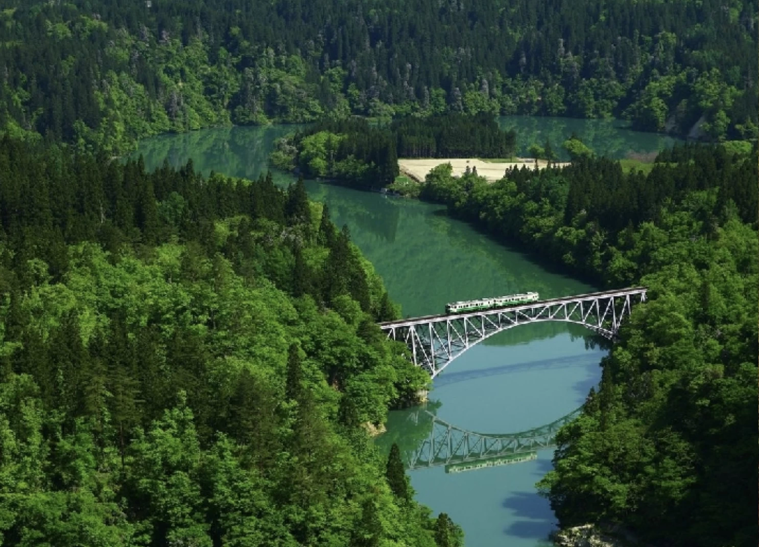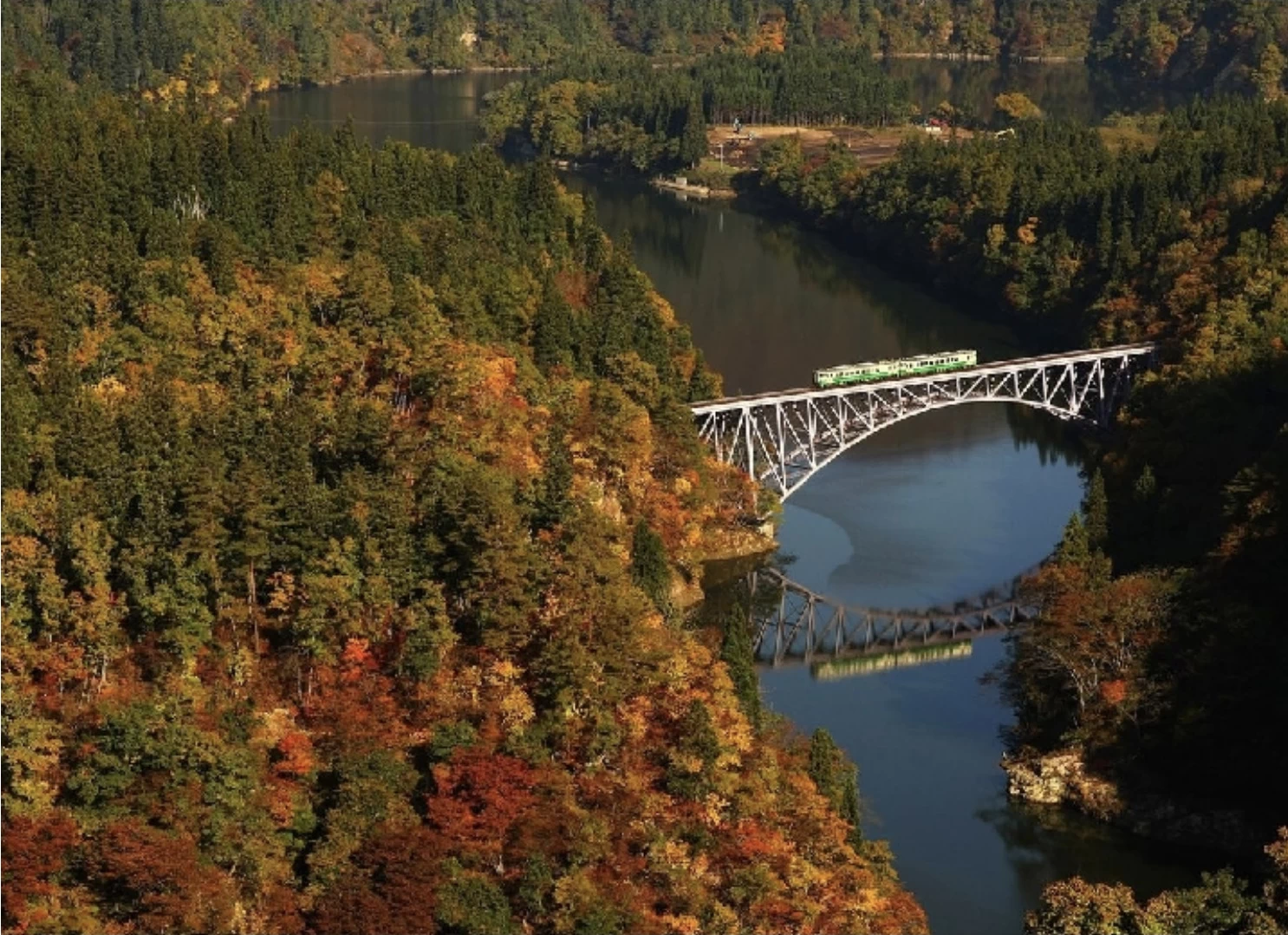 「第一只見川橋梁展望台」は、只見川を縫うように走る、JR只見線を望める絶景スポットです。只見線は紅葉の名所として人気のあるローカル線で、なかでもこのスポットから望む景観は印象的な美しさです。展望台は撮影スポットとしても人気があり、川面に映る紅葉と鉄橋を渡る列車が一体となった美しい瞬間に出合えます。紅葉の見頃は例年10月下旬から11月中旬で、雄大な只見川の渓谷美と周囲の山々が織り成す彩りは、訪れる方を魅了します。