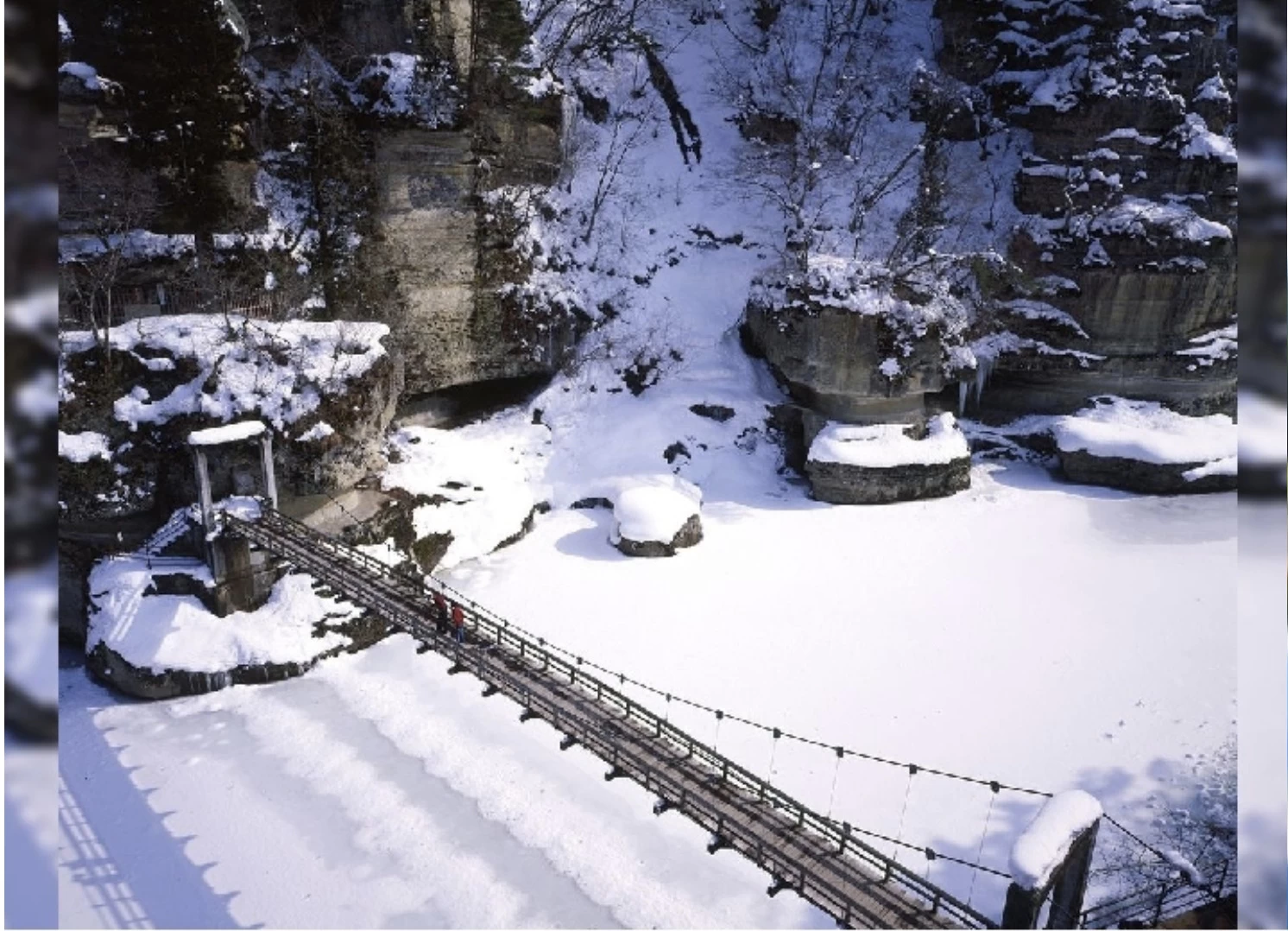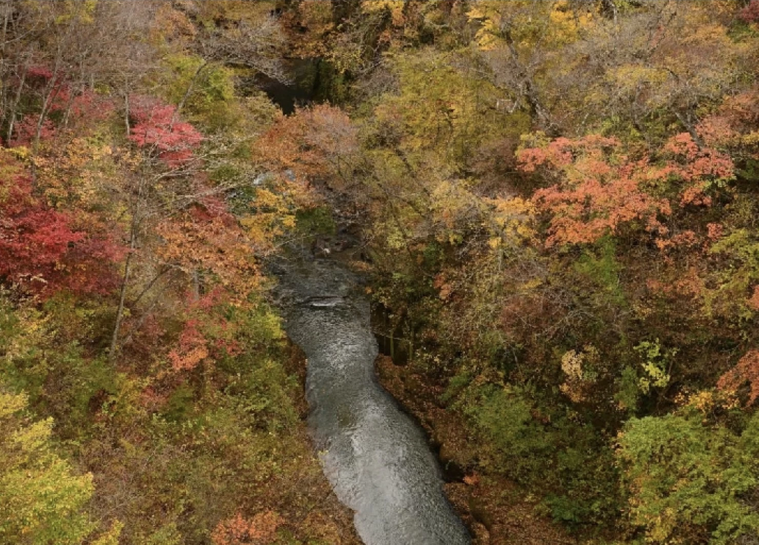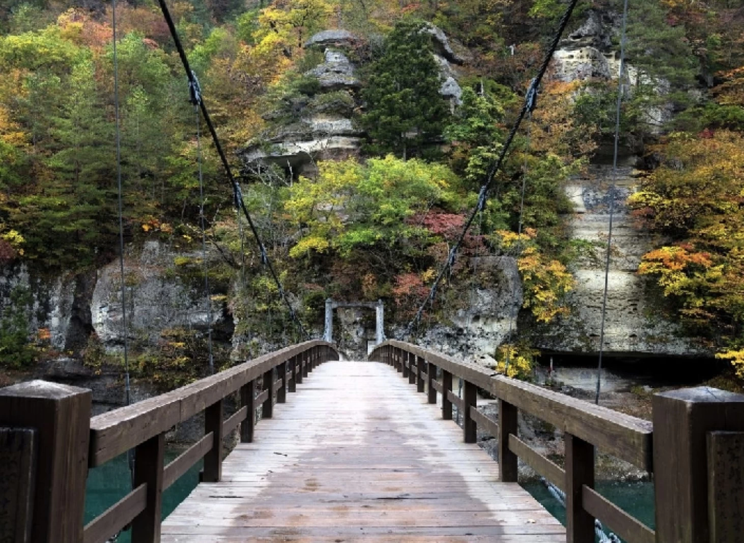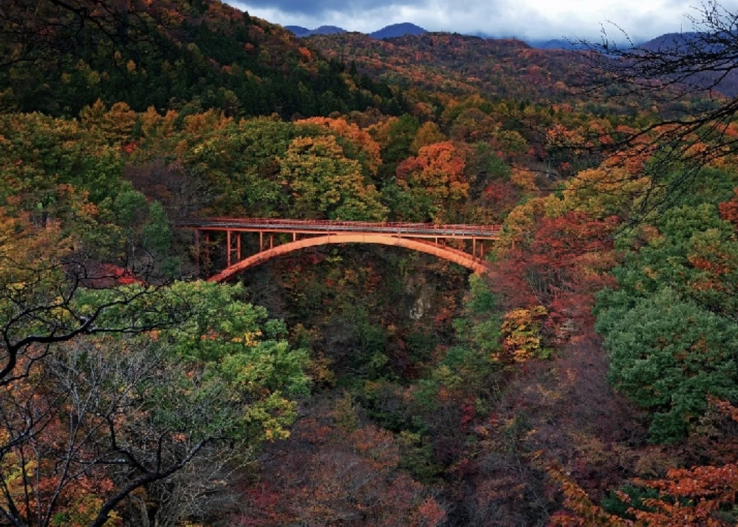 「雪割渓谷(雪割橋)」は長さ約138m、高さおよそ60mのアーチ式鉄橋「雪割橋」が架かる峡谷です。例年10月下旬から11月上旬は紅葉の見頃であり、カエデやブナ、ナナカマドが赤や黄に色づき、橋の上からは絶壁と調和した壮大な景色を一望できます。隣接する遊歩道には展望スポットがあり、紅葉した木々や渓谷、雪割橋、那須連峰を望む絶景も楽しめます。