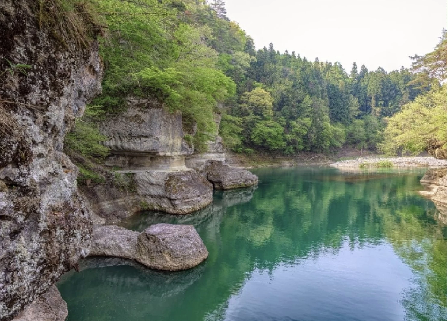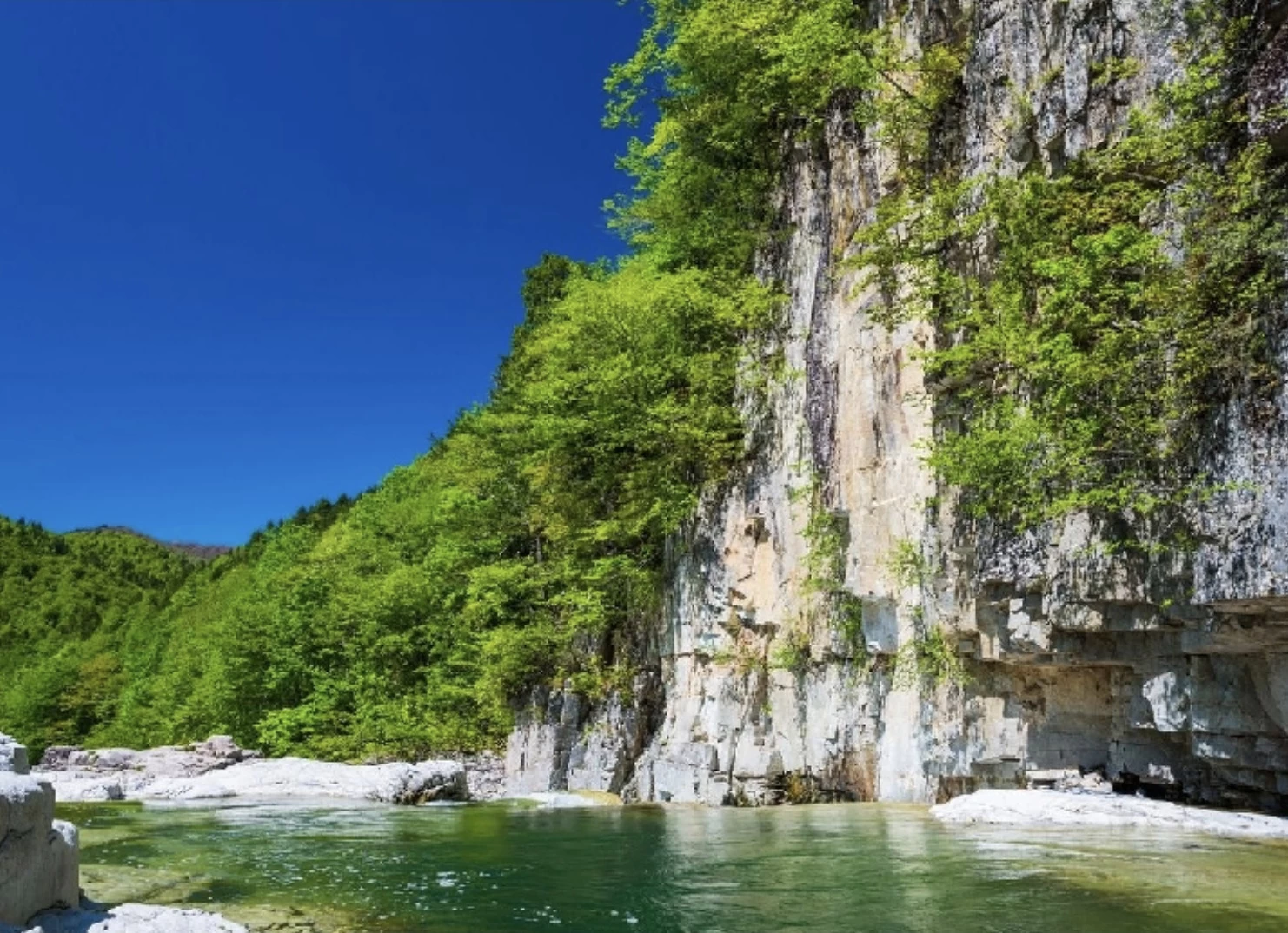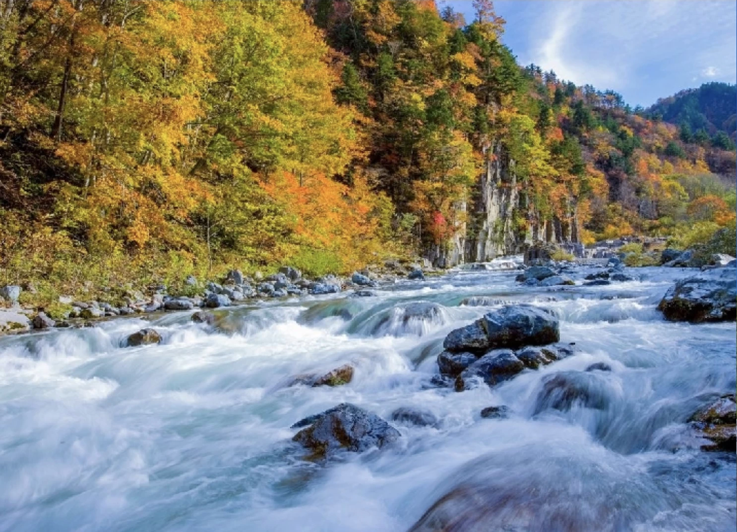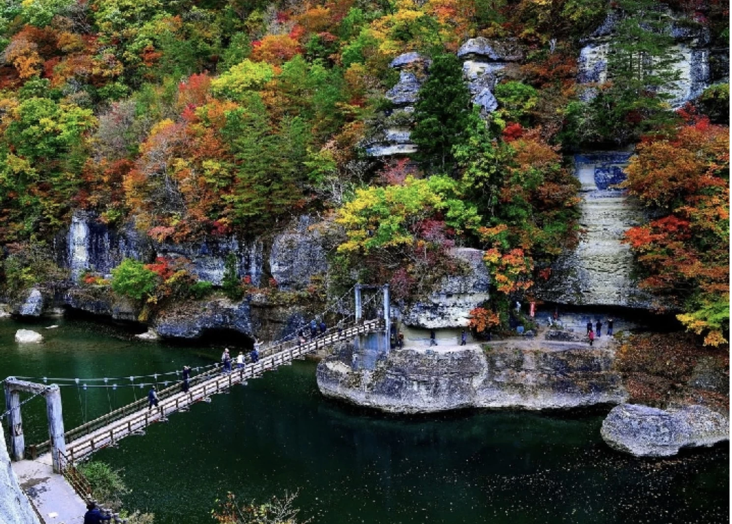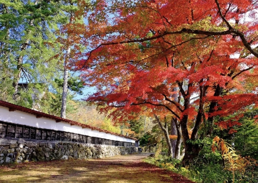 「屏風岩(びょうぶいわ)」は、伊南川のほとりにそびえ立ち、長い年月をかけて急流に削られた岩肌が屏風のように見える奇岩です。紅葉の季節には、白い岩肌に赤く染まったモミジが映え、鮮やかなコントラストが広がります。周辺には全長約200mの遊歩道が整備されており、紅葉の見頃を迎える例年10月中旬から下旬には、渓谷美を満喫したい多くの観光客でにぎわいます。