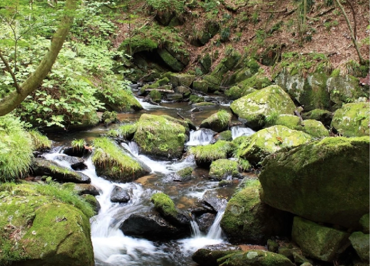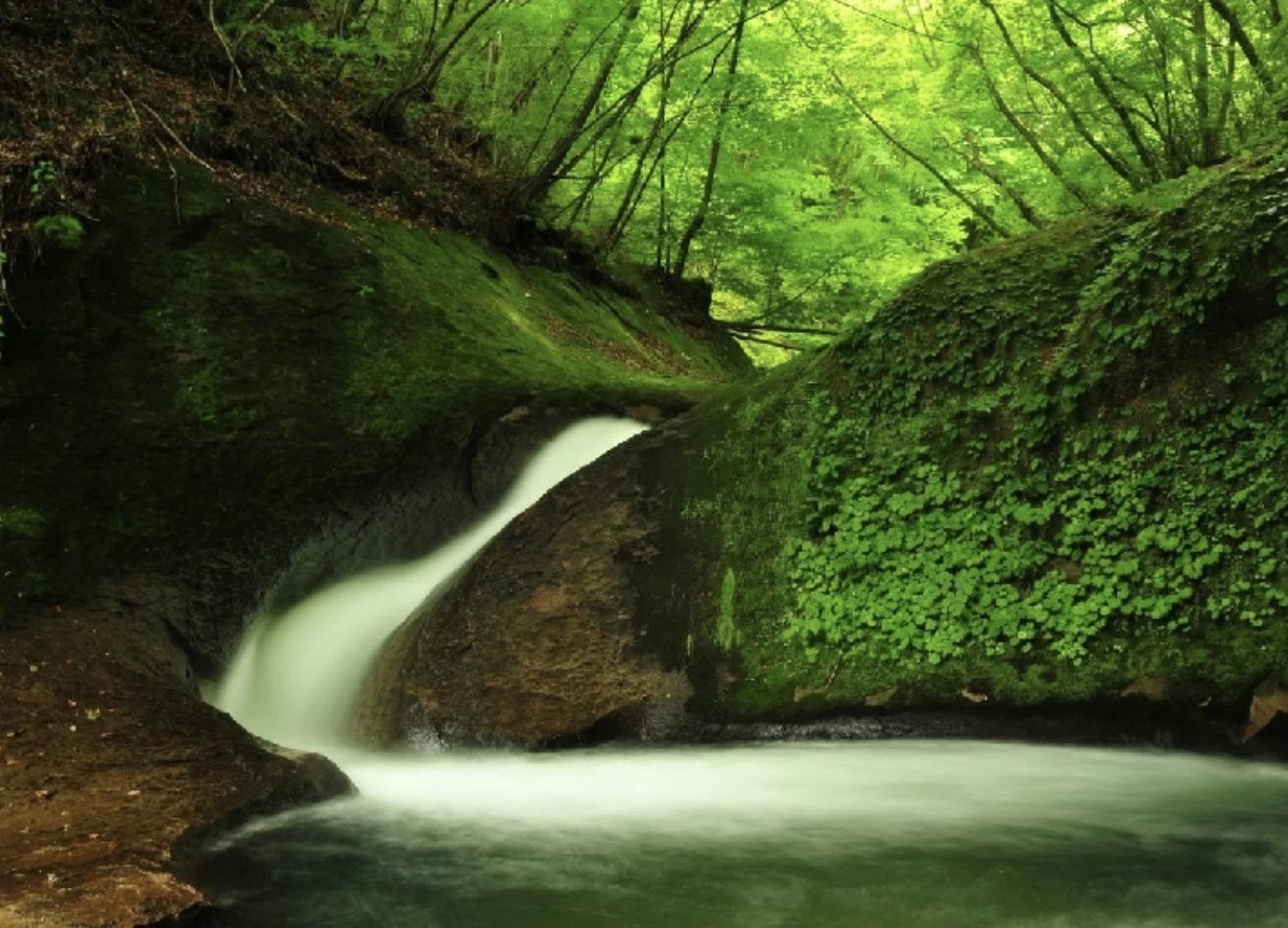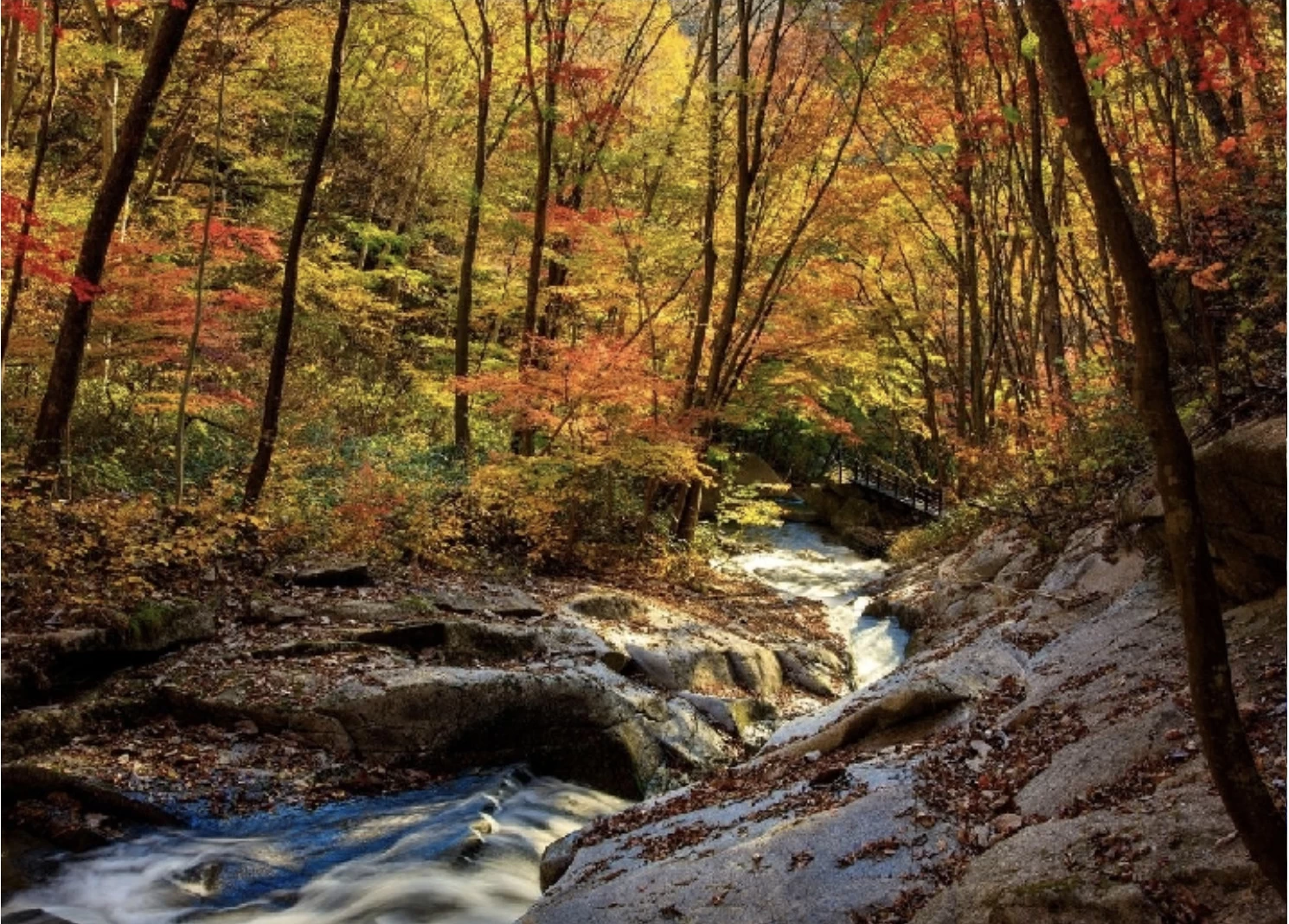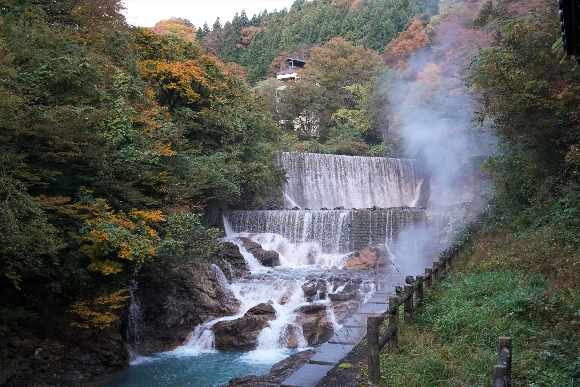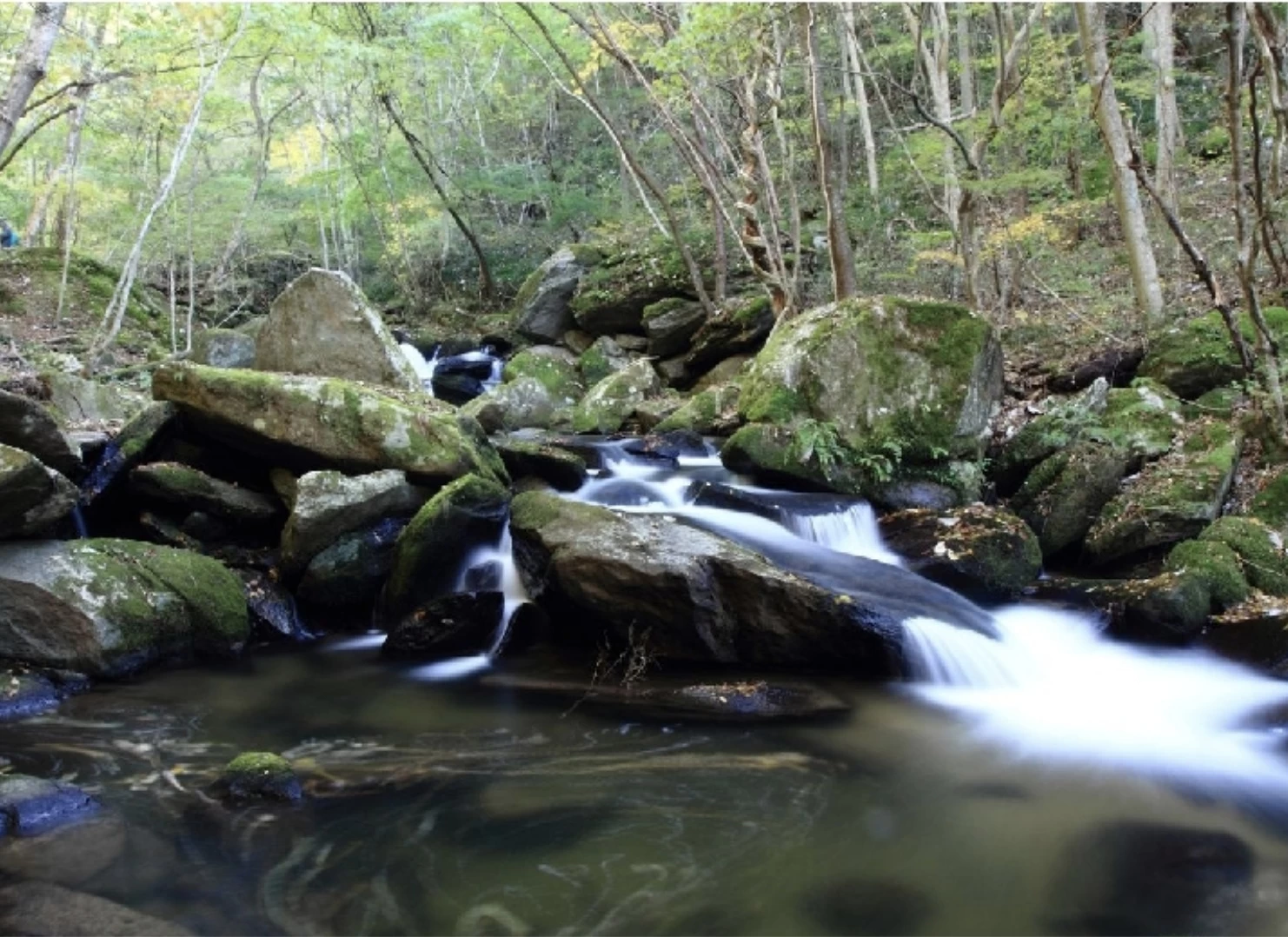 「滝川渓谷」は遊歩道沿いに大小さまざまな四十八滝(しじゅうはったき)が連続している、福島県でもめずらしい景勝地です。周辺には美しい滝や巨大な岩、古木が生い茂り、手付かずの自然に近い風景を満喫できます。春の花や夏の深緑、秋は赤や黄色に彩られた、四季ごとの多彩な景色が魅力。例年11月上旬から中旬にかけてが紅葉の見頃となり、迫力ある滝の数々に紅葉した木々が彩りを添え、秋ならではの景色が楽しめます。