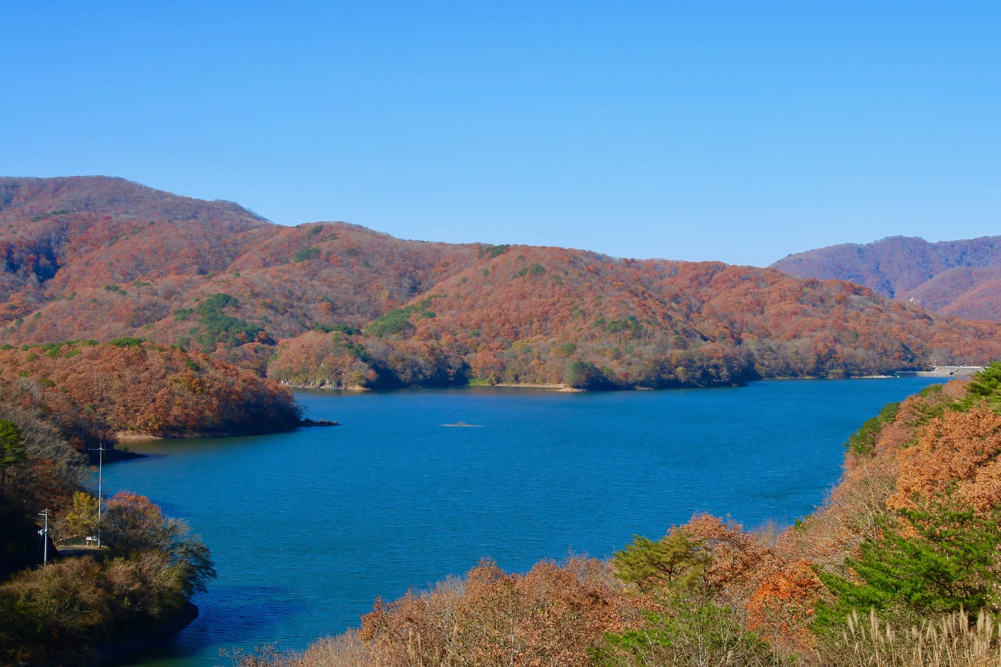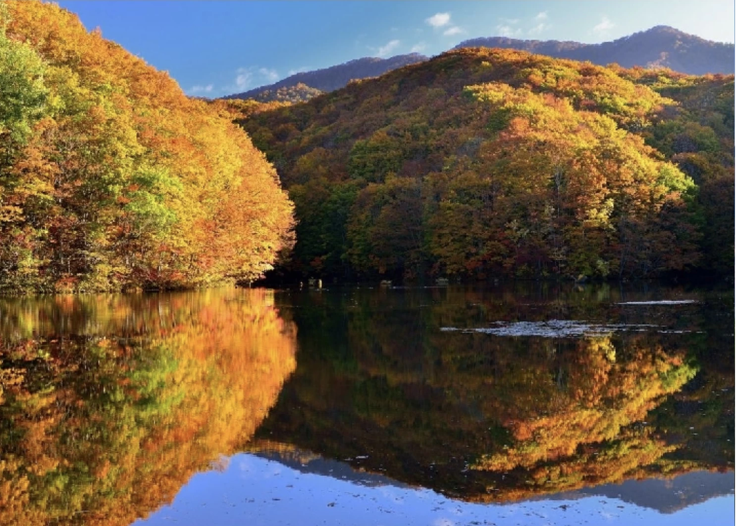 「羽鳥湖(はとりこ)」は、太平洋側と日本海側の別れ目となる、標高約600mの地点に造られた人造湖です。「東北の軽井沢」とも呼ばれる、標高約700mから1,000mの羽鳥湖高原の中心に位置し、大川羽鳥県立自然公園に指定されています。10月下旬の見頃になると、モミジやカエデ、ドウダンツツジが赤や黄色に色づきます。湖畔には約8kmのサイクリングコースが整備されており、レンタサイクルを利用して散策も可能。