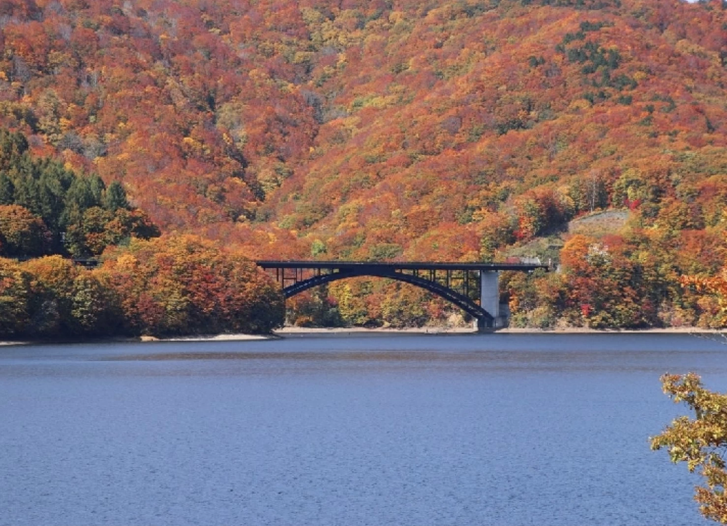 「桧原湖(ひばらこ)」は、磐梯山の噴火によって誕生した、美しい島々が点在する湖です。裏磐梯観光の拠点として知られており、カヌーやカヤックなどのアクティビティも楽しめます。モーターボートや観光船も運航され、湖畔とはひと味違う絶景を望めるのも魅力です。紅葉の見頃は例年10月中旬から下旬で、カエデやウルシ、モミジが色づき、湖岸を鮮やかに彩ります。