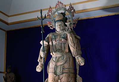 特に注目すべきは、兜跋毘沙門天立像です。坂上田村麻呂が北方鎮護のために祀ったと伝わるもので、平安中期ごろの作とされています。高さ約4.3mのけやきの一本造りで、国内唯一の仏像として国の重要文化財に指定されています。輪宝火焔の光背を背に、左右の二鬼とともに直立する姿は、迫力と風格を兼ね備え、見る者を圧倒します。