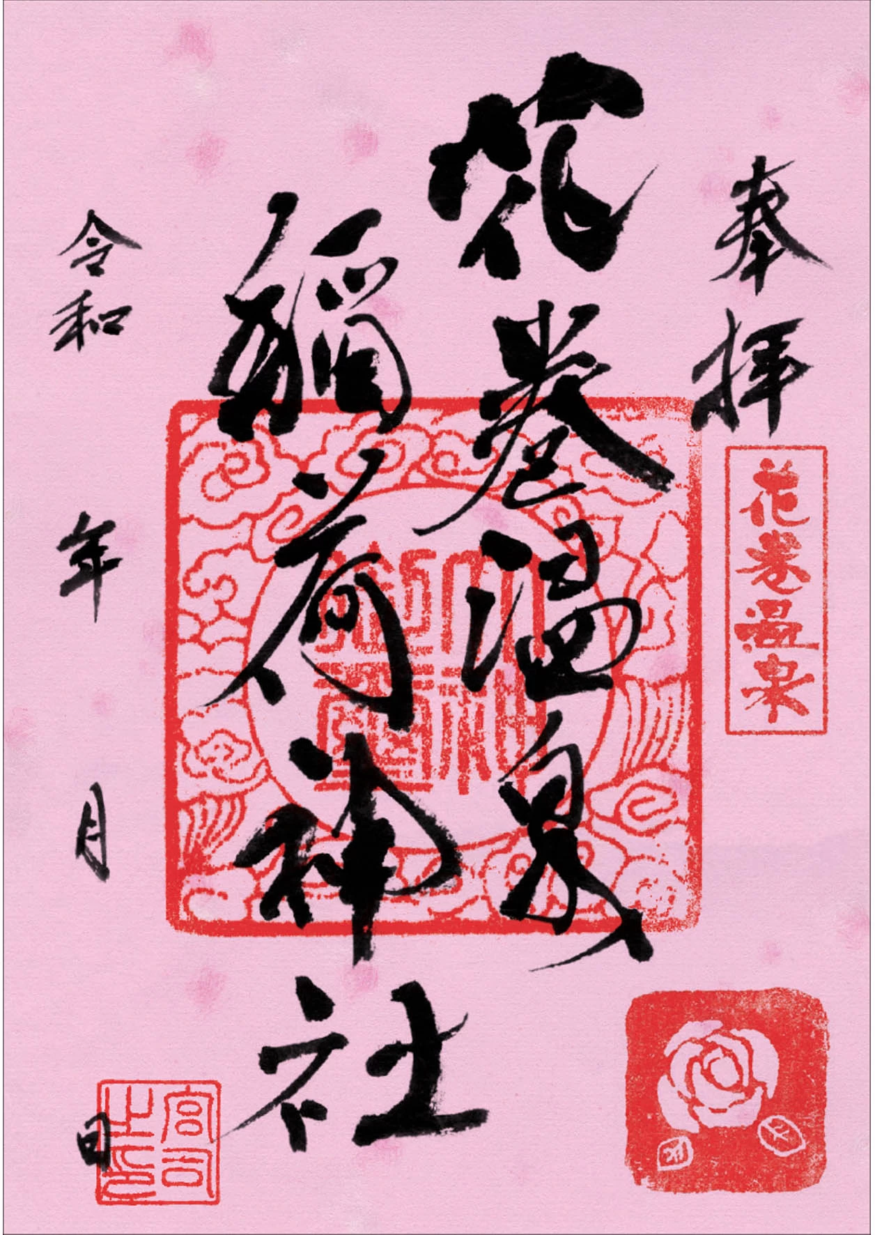 絵馬には、花巻温泉の公式キャラクター「フクロー(福来)」がデザインされており、参拝者に人気です。また、ピンクの台紙にバラの花のスタンプが押された、かわいらしい御朱印も評判を呼んでいます。なお、御朱印の授与は温泉ベーカリー、および各ホテルのフロントで行っています。