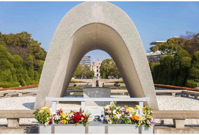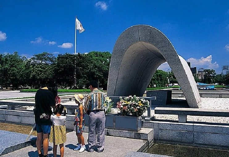 原爆ドーム前駅から徒歩5分、広島平和記念公園内にある「広島平和都市記念碑」は、原爆死没者の慰霊と鎮魂を目的に建設された慰霊碑です。「安らかに眠って下さい 過ちは繰返しませぬから」と刻まれた碑文には、過去の悲劇を繰り返さず平和を誓う想いが込められています。埴輪(はにわ)の家形を模し犠牲者の霊を雨露から守るという願いを表現したデザインも、ぜひ近くでご覧になってみてください。訪れる人々に平和の尊さを訴えかける象徴的な場所として、家族や大切な人とぜひ訪れたいスポットです。