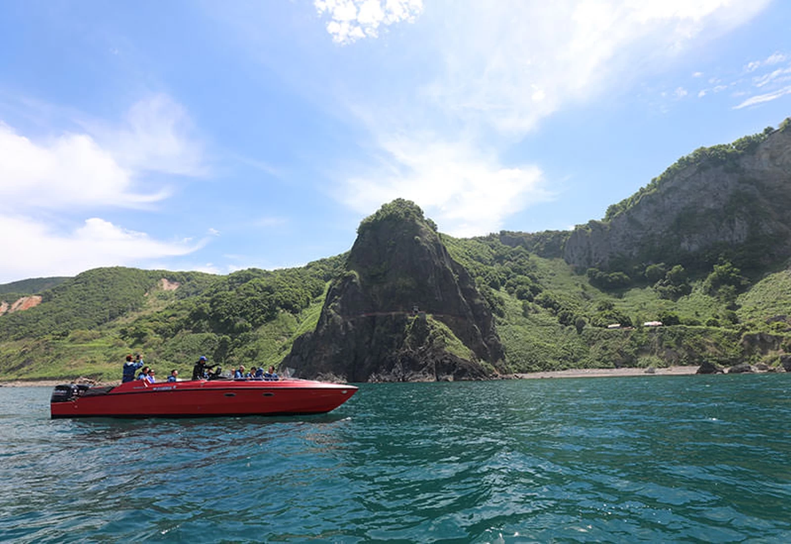 ウトロ港から出航する観光船。船上からは知床半島を眺められます。複雑な海岸線を描く断崖や、その断崖から流れ落ちる滝 をゆったりと船から観賞できます。