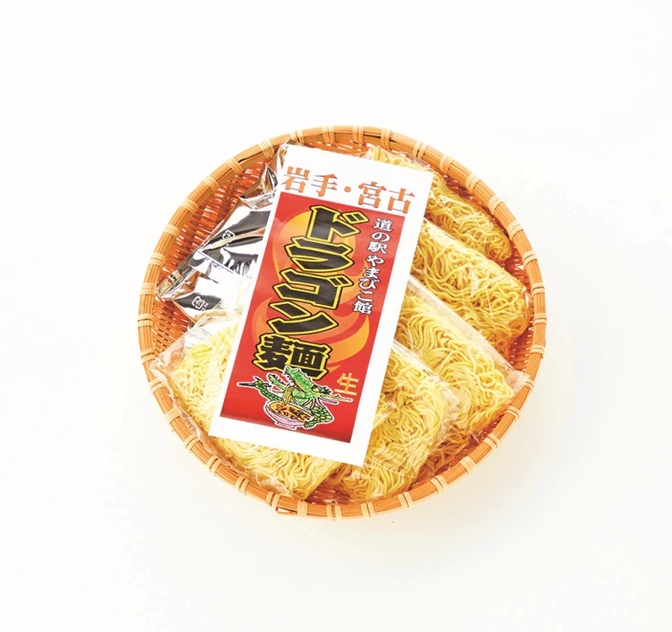「ドラゴン麺」は、「道の駅 やまびこ館」で誕生した名物旨辛麺で、火を噴くほどの辛さというイメージからその名が付けられました。味噌ベースに醤油、コチジャン、オイスターエキスを加えた中辛スープが特徴で、国内製造の生中華麺にはキャベツ、にんじん、きくらげなどの野菜がマッチしています。2024年には地元アニメとのコラボパッケージ版も限定発売され、話題となりました。