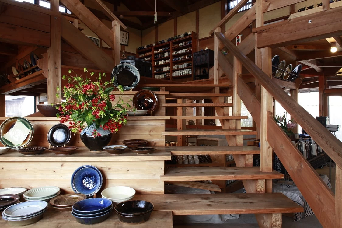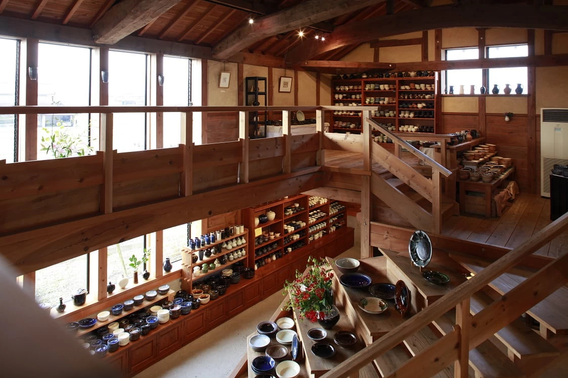 1947年(昭和22年)8月、農村工業の共同体構想を掲げた5人の青年が創業した出西窯。元の農協米倉庫をリノベーションした工房は、屋根に赤茶色の石川瓦を使った出雲地方特有の建築美が魅力。工房内では16人の陶工がひとつひとつ手仕事で作品を仕上げる様子を見学できます。工房隣で展示販売を行う「くらしの陶・無自性館」では、日々のくらしで使える素朴で美しい器が購入できますよ。