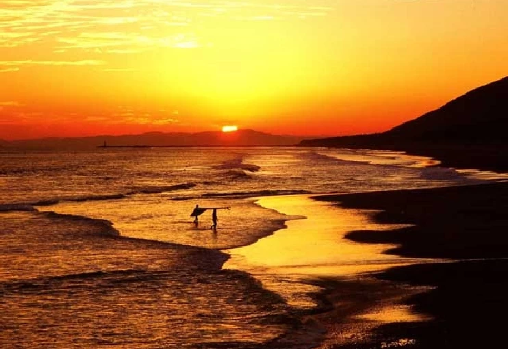 三河田原駅から車で約15分の場所にある全国屈指のサーフポイント。海面を赤く染める夕やけはドライブにぴったりで、カップル旅にもぜひおすすめ。ビーチ沿いにはヤシの木が並び、南国の雰囲気もリゾート感が漂います。