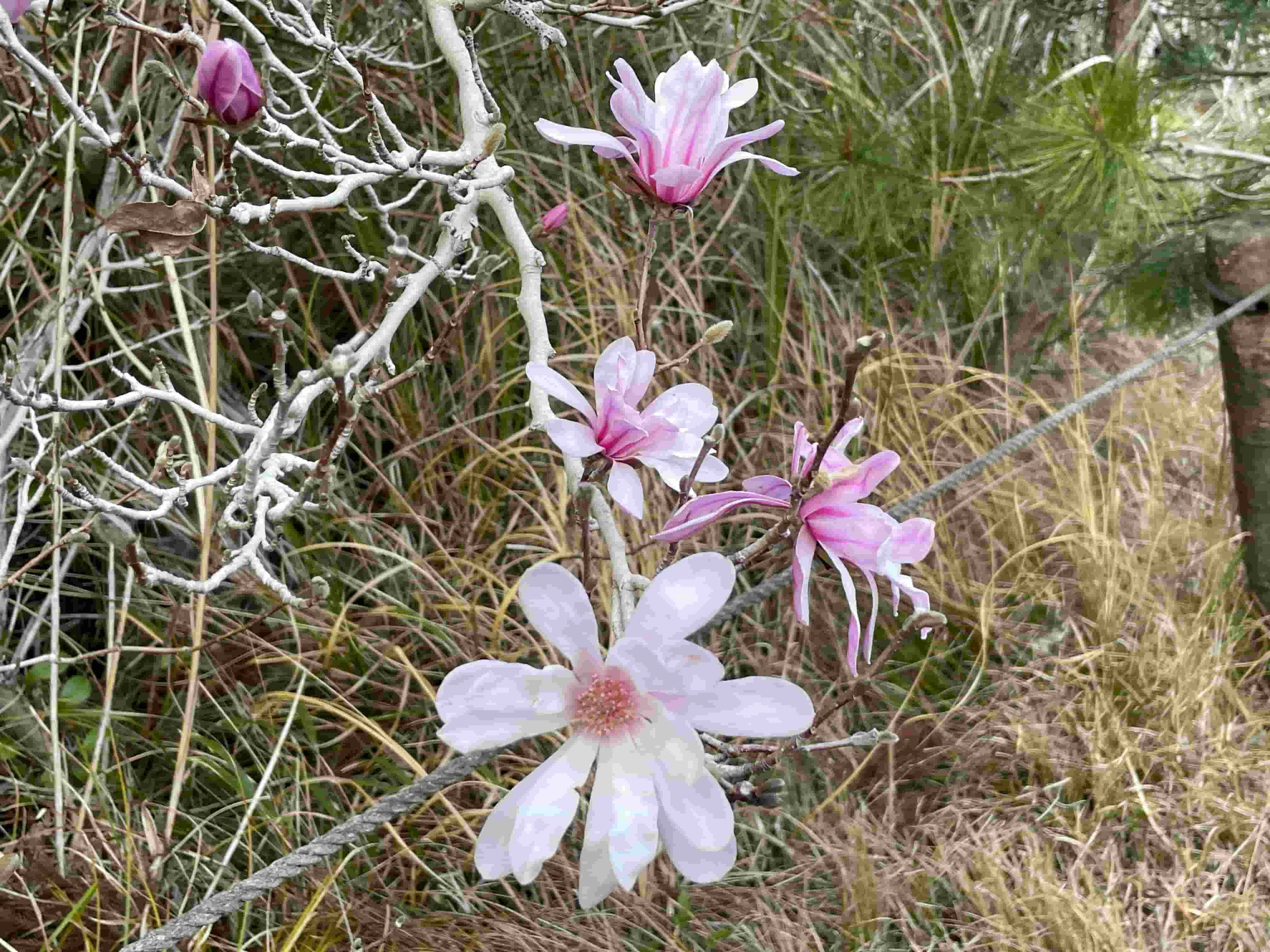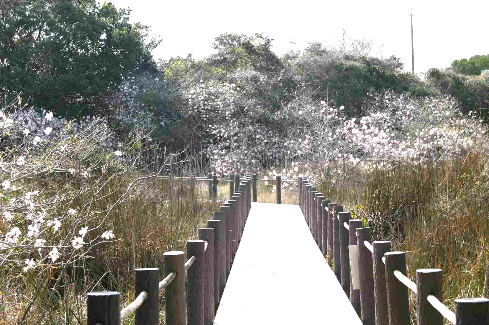愛知、岐阜、三重の伊勢湾周辺の丘陵地の湿地など、限られた場所に自生するシデコブシ。県の天然記念物にも指定されている黒河湿地植物群落のシデコブシ自生地には約200株のシデコブシが自生し、春に美しい花を咲かせます。また、伊勢湾周辺の湿地にのみ分布する絶滅危惧種のシラタマホシクサや寒冷地の植物であるヤマモモ科の落葉小木ヤチヤナギなど、貴重な植物も数多く群生しており、散策途中に立ち寄るにもおすすめです。