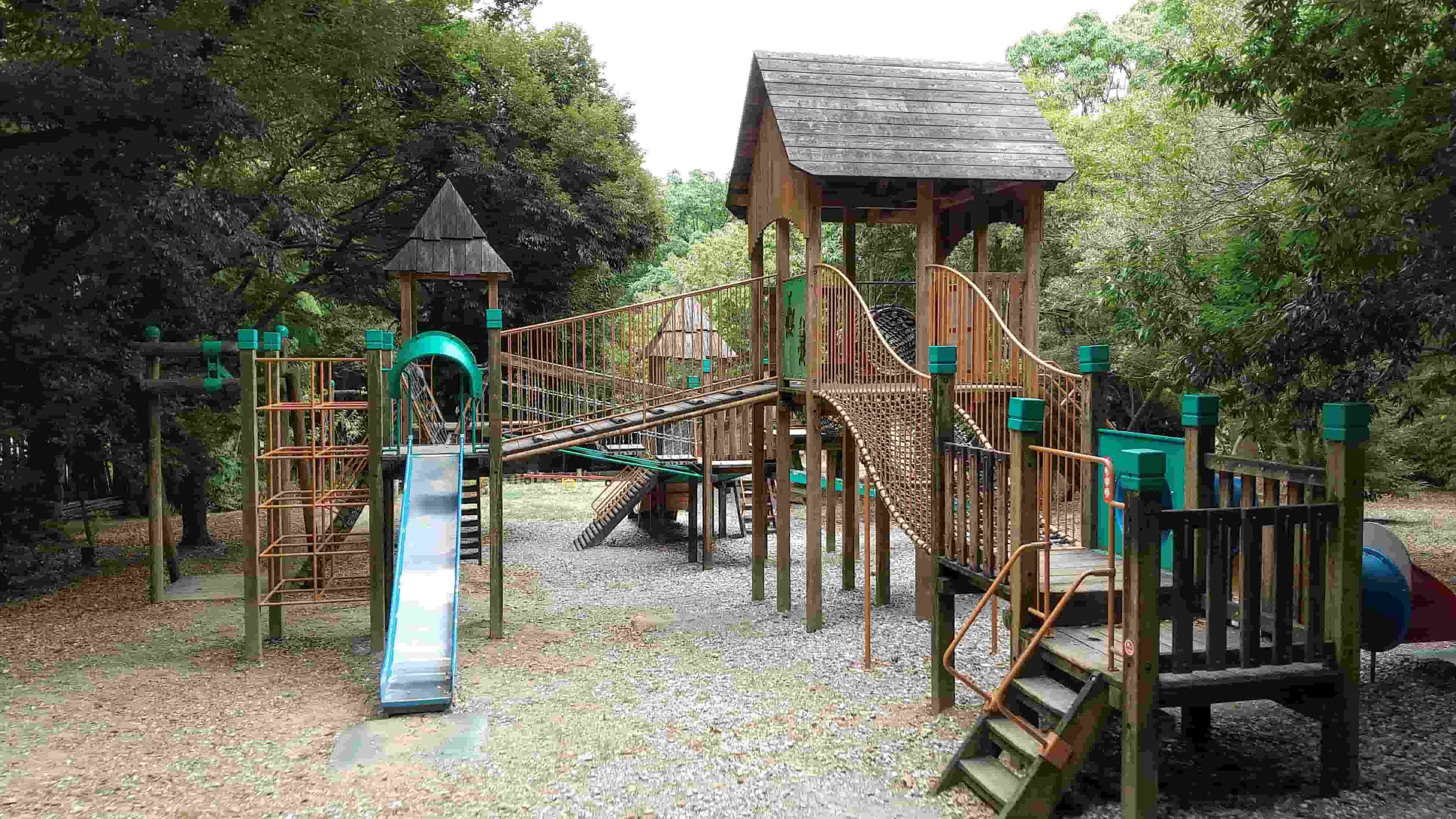 三河田原駅より車で約5分、蔵王の麓にある自然に囲まれた公園。冠木門は蔵王山頂へのハイキングコース入口になっており、その先には朱塗りの鳥居や風情ある石仏があります。公園内には、ターザンロープやシーソー、平均台など木の遊具やアスレチックが点在していてお子さん連れにもぴったりですよ。