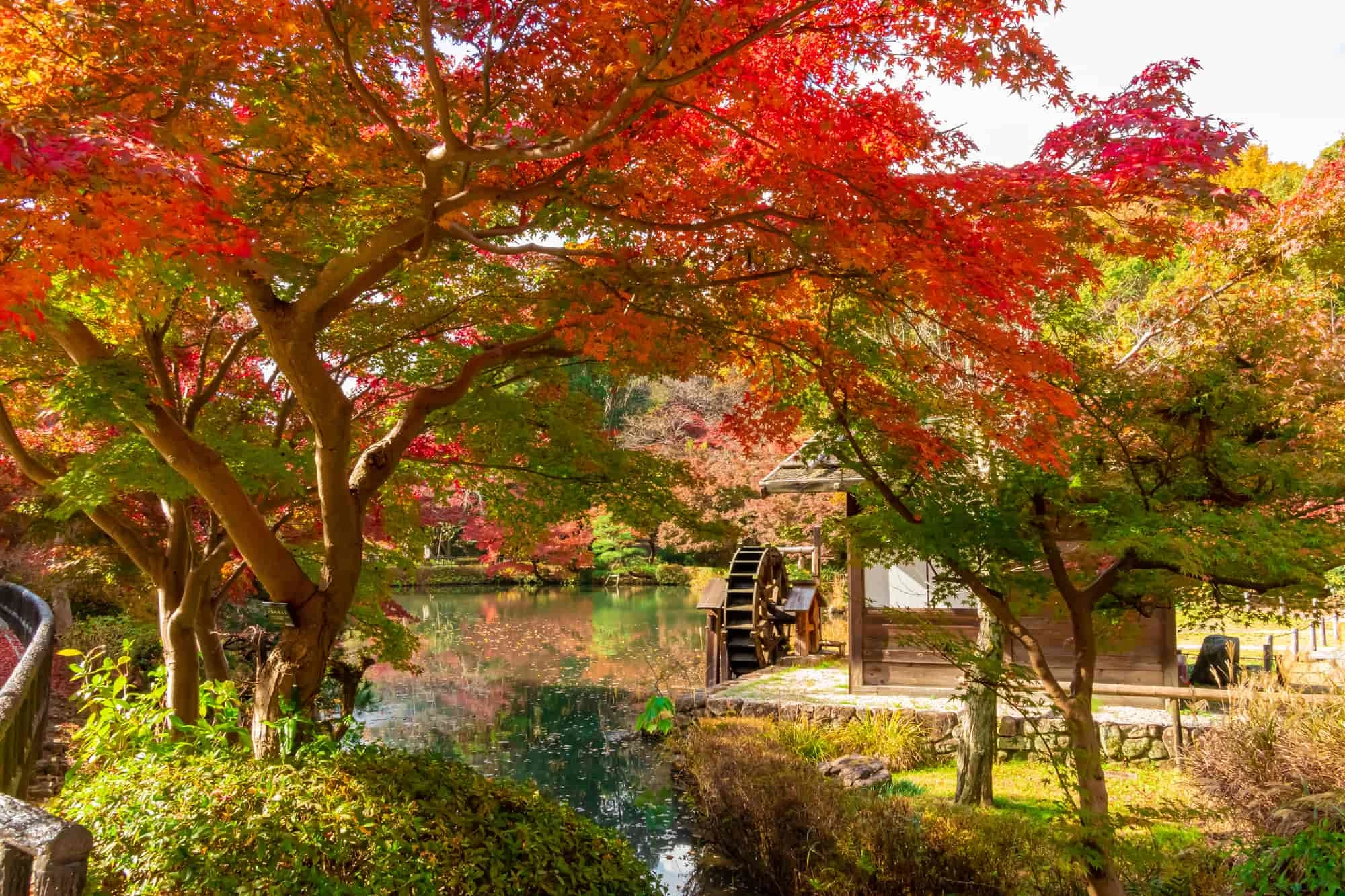 JR中央線「鶴舞駅」から徒歩すぐとアクセス抜群の場所にある公園で、紅葉狩りを楽しむのに最適です。園内には多くの花や木が植栽されており、例年11月上旬~12月上旬になると、紅葉が見ごろを迎えます。おすすめの観賞ポイントは、公園の北東側にある「胡蝶ヶ池」と「秋の池」。それぞれに、のんびりと過ごせる四阿が設置されています。「秋の池」では、その名の通り、モミジやハゼノキなど、秋を彩る紅葉を眺められます。