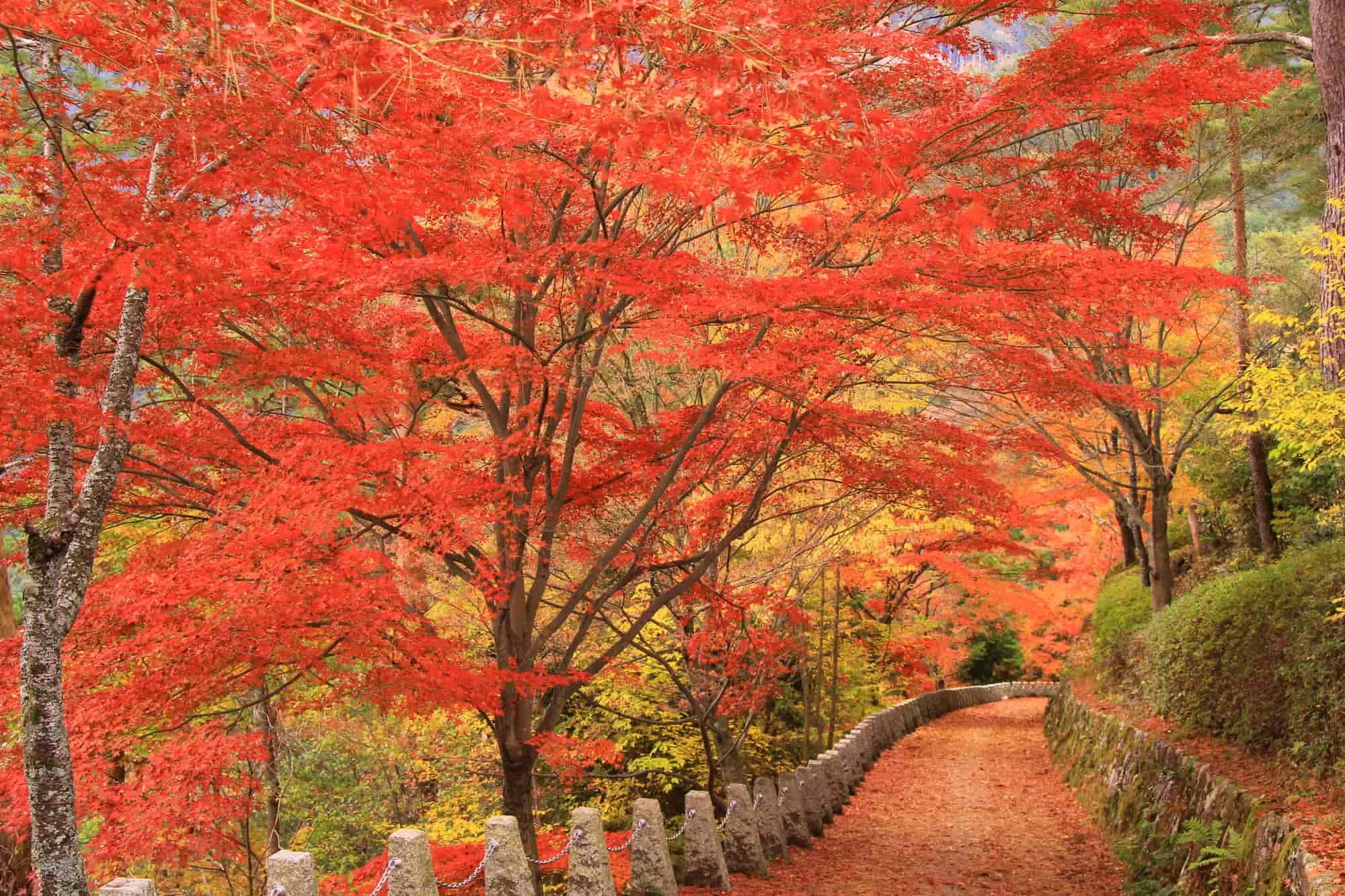 室生寺(むろうじ)は、真言宗室生寺派の大本山です。多くの寺院が女性の立ち入りを許さなかった時代にも、女性を受け入れてきたことから「女人高野」として広く親しまれてきました。11月中旬から12月上旬になると、太鼓橋から本堂までの参道が色鮮やかなモミジに彩られます。また、例年11月の土日祝日に壮大なライトアップイベントが行われます。幻想的な夜の紅葉を体験できる貴重なスポットです。