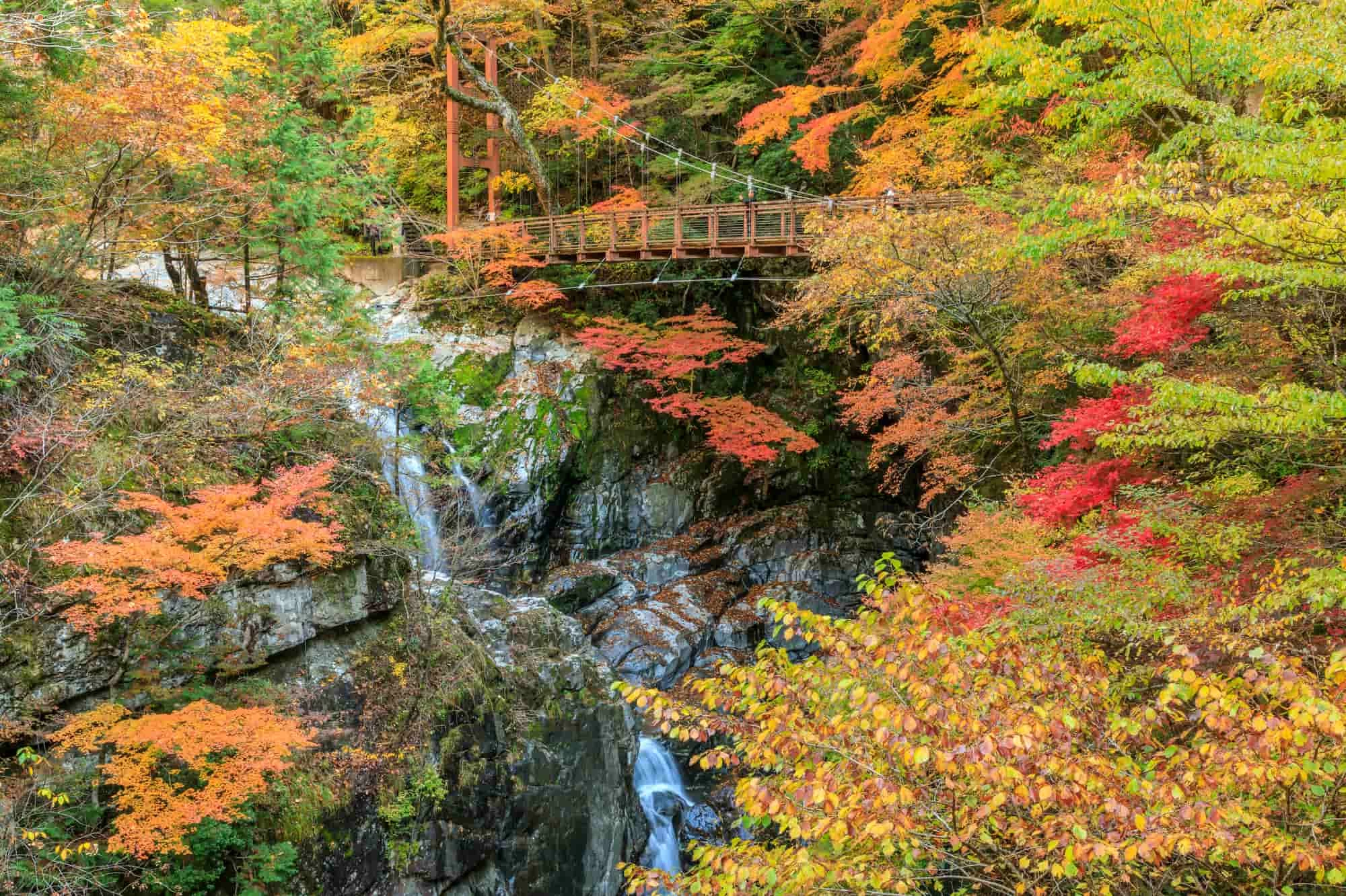奥香落渓(おくこおちだに)は、曽爾村(そにむら)の落合から長野までの間の青蓮寺川(しょうれんじがわ)沿いの渓谷の総称です。川の両側に連なる奇岩が特徴で、なかでも幅約700メートル、高さ約200メートルの絶壁を誇る小太郎岩は圧巻です。11月上旬から下旬の紅葉の季節になると、モミジが小太郎岩を覆い尽くし、美しい渓谷美が誕生します。自然のパワーを実感したい方にぴったりのスポットです。