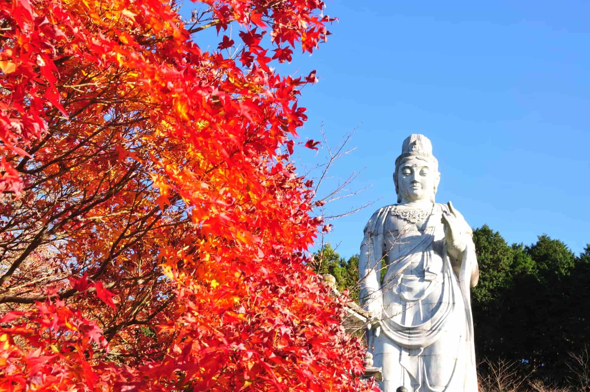 紅葉に包まれた大石仏のライトアップショーを楽しもう