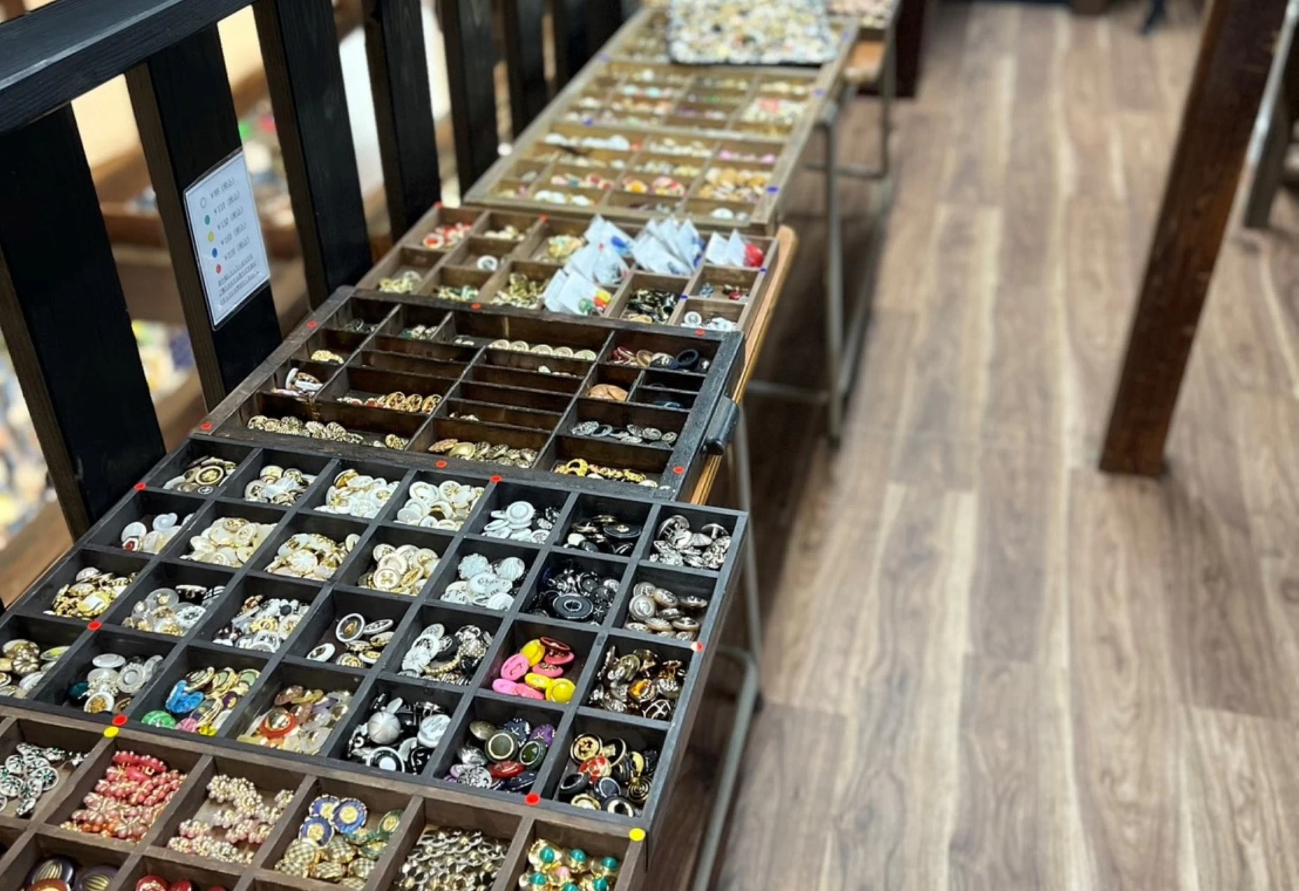 アンティーク什器に囲まれた空間は、まるで宝箱のよう。2階には希少なボタンやパーツも充実しており、ハンドメイド好きにはたまりません。訪れるたびに新しい発見があるこの場所で、世界にひとつだけの特別な「奈良の思い出」を探してみてはいかがでしょうか。