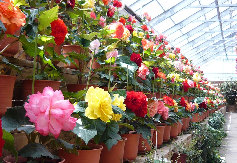 敷地面積約4000坪、関東以北で最大規模を誇るベゴニア園で、大小2つの温室では、1年中満開の花々を観賞できます。なかでも長さ90m幅20mの大温室の天井一面から釣り下がる球根ベゴニアキングタイプは約600鉢もあり、その豪華絢爛な美しさは息を呑むほど。