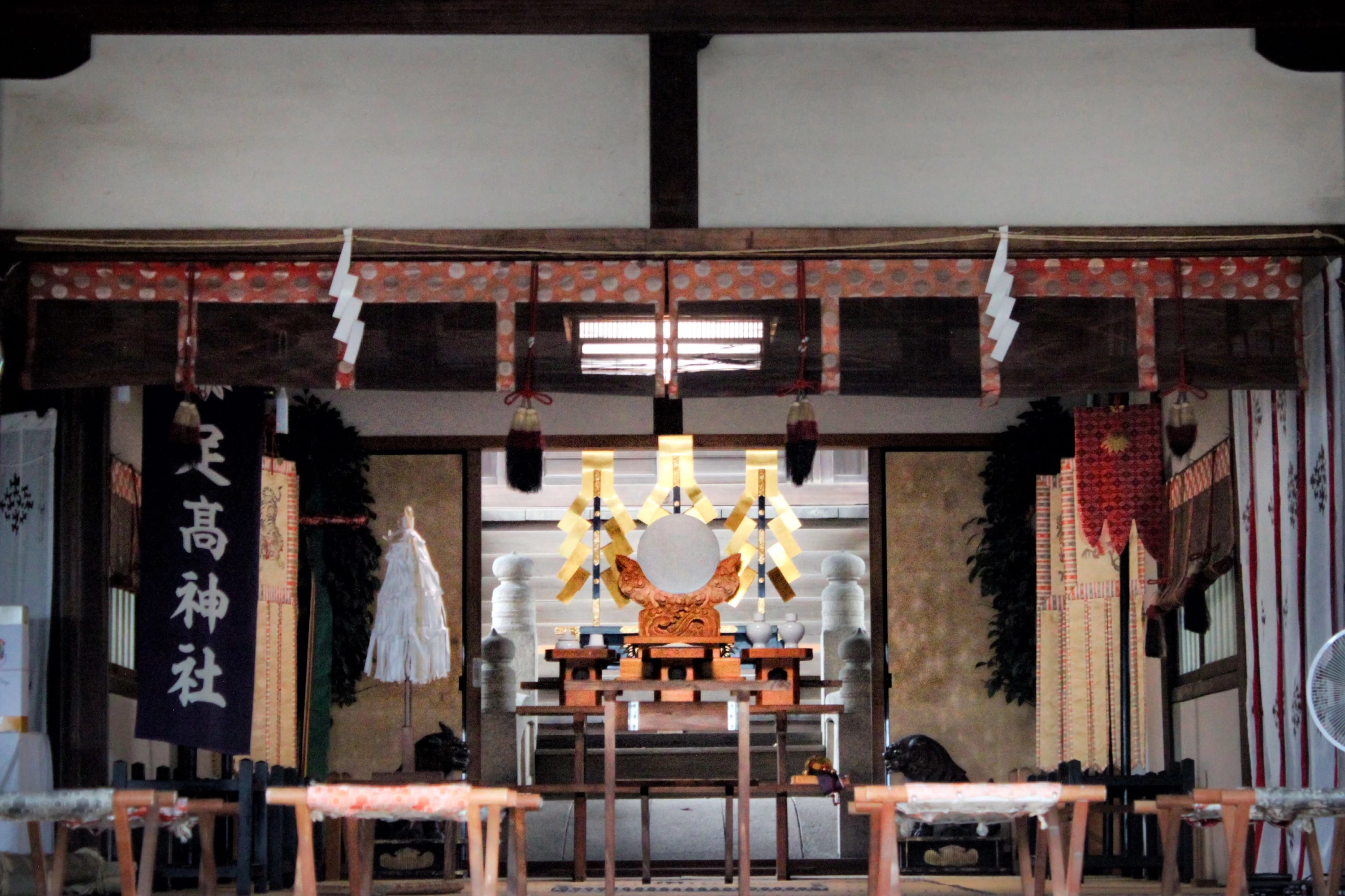 岡山県倉敷市の中心部、国道2号笹沖交差点から西へ約500m、足高山の山頂に鎮座する足高神社は、第10代崇神天皇の代に創建されたと伝わる古社です。平安時代に編さんされた「延喜式神名帳」に記載された備中18社の1つで、長い歴史を誇ります。かつてこの地は四方を海に囲まれた島であり、往来する船は帆を下げて航海の安全を祈願するのが習わしでした。それを怠ると船が転覆したと伝えられ、“備中帆下げの宮”として人々に崇められてきました。その御神威は荒く、一時は山の裏側に社殿を遷したものの、1695年(元禄8年)に現在の山頂へ遷座し、今日に至ります。