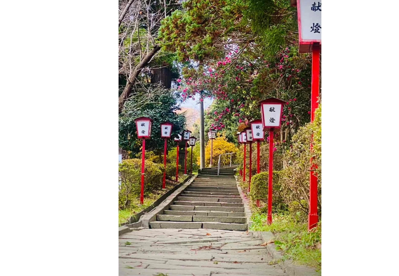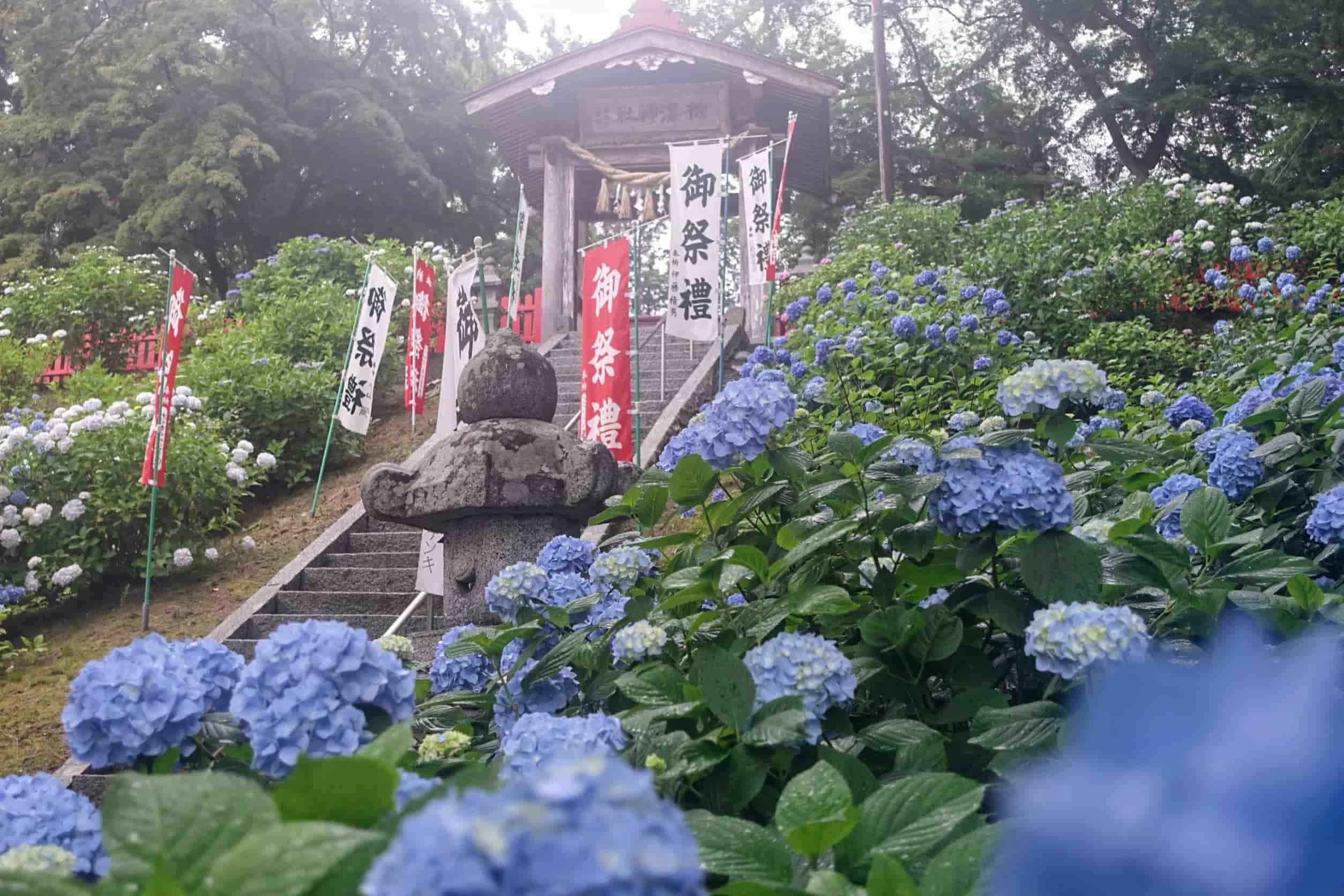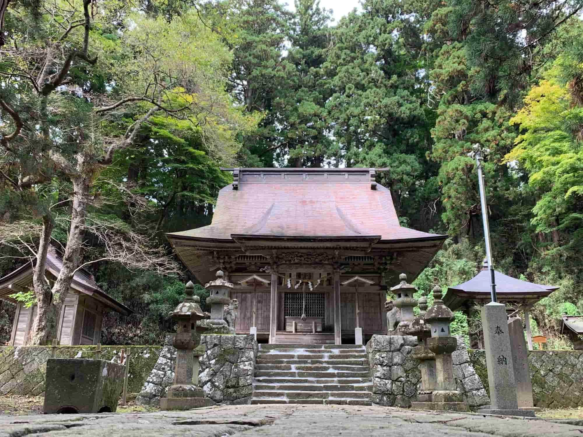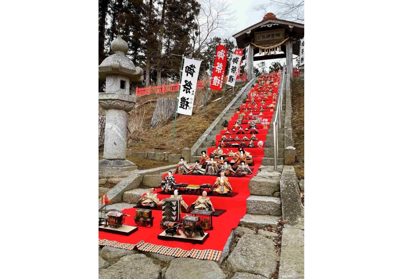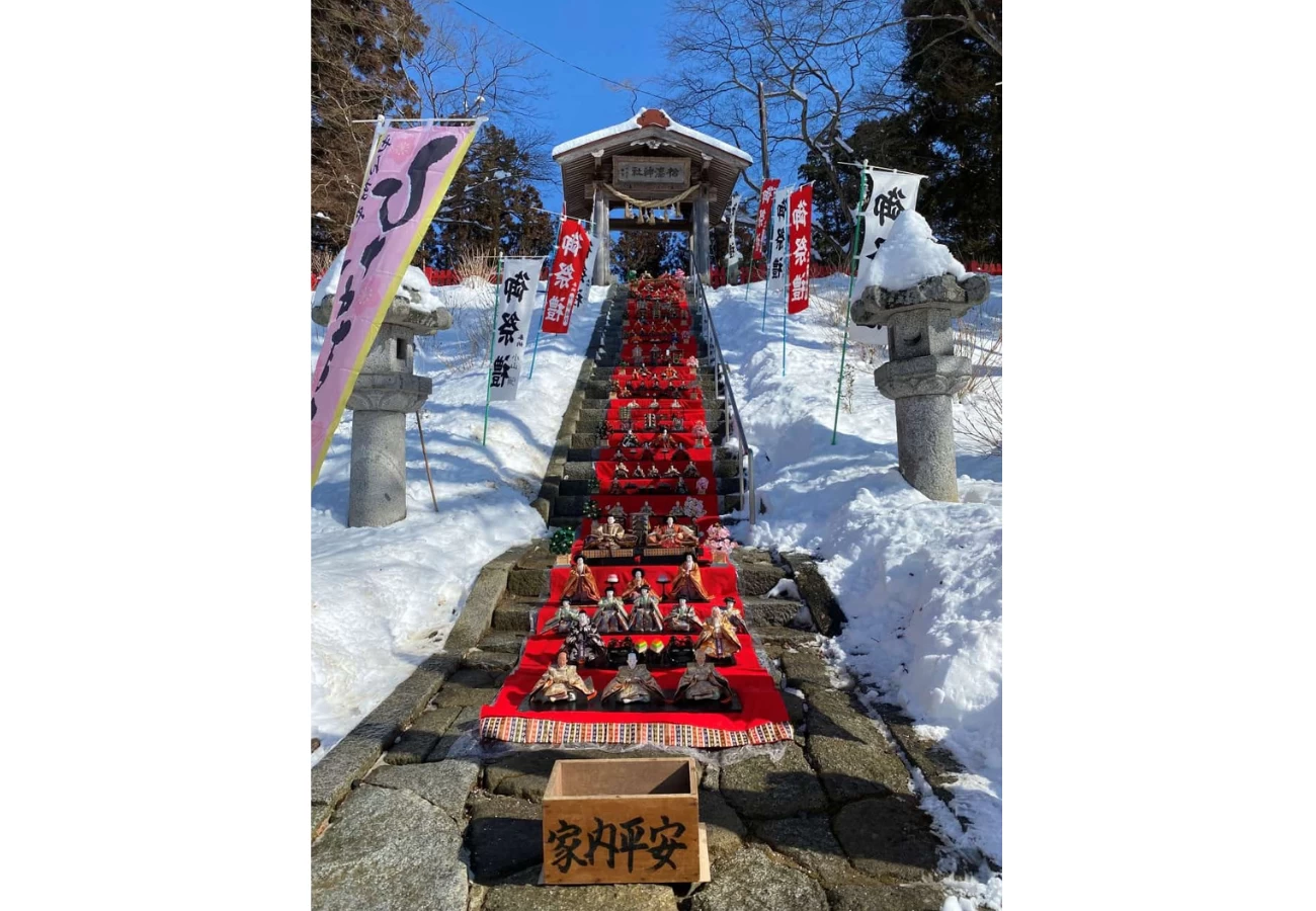 伊邪那美命(いざなみのみこと)を主祭神とし、千厩町の氏子崇敬者を守護する産土神社(うぶすなじんじゃ)として、地元の人から心の拠り所として親しまれている神社。開運厄除け、子宝、縁結び、五穀豊穣などのご利益があるとされ、6月には地域の人たちが植樹した約1,200株のあじさいが一斉に見頃を迎える「あじさい神社」としても有名です。2/11〜開催の町内ひな祭り期間には三十三段の石段と拝殿に300体以上のひな人形が飾られ、圧巻の光景が楽しめますよ。