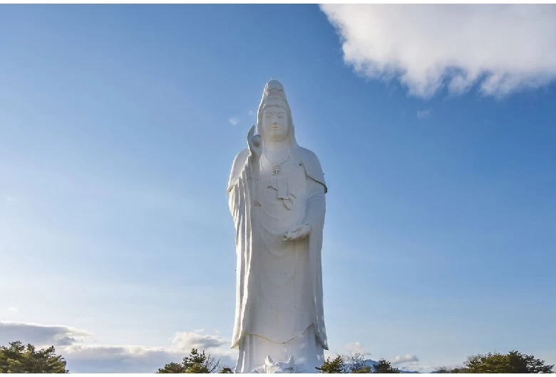 高さ100mの大観音の胎内には「龍の口」の形をした入り口から入り、エレベーターを利用します。内部は12層に分かれており、1層には十二神将や三十三観音、水子供養殿があり、3層から11層には108体の仏像が安置されています。中心部のらせん階段から下を覗き込むと幻想的な空間が広がっており、フォトスポットとしても人気です。