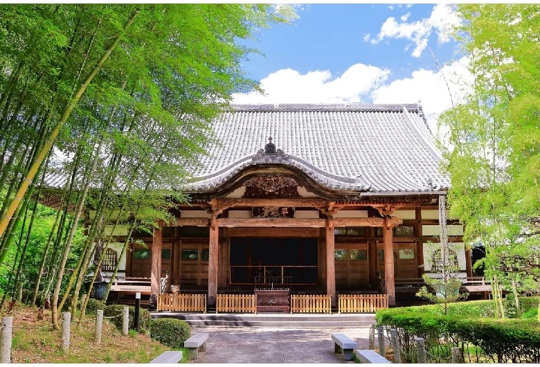 1278(弘安元)年から1288(弘安11)年に創建。かつては学問の中心として栄えたお寺です。現在はあじさいの名所として知られ、6月には1200株のあじさいが一斉に花を咲かせます。特に、山門までの参道に咲くあじさいが階段の両脇からあふれ出す様子が見どころです。あじさいのほかにも、市の保存樹木であるハクモクレンや椿、梅といった多様な花を季節の移ろいとともに楽しめます。