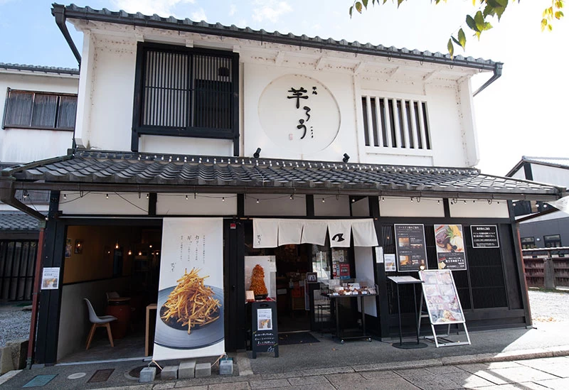JR彦根駅より車で約20分ほどの場所にある、彦根城下の町屋がずらりと並ぶ「夢京橋キャッスルロード」の一角にある「芋処 芋ろう」。手間をかけてじっくり焼き上げた「壺焼き芋」や名物「生蜜 芋けんぴ」、焼き芋を使った「芋パフェ」「焼き芋ブリュレ」「蜜芋ミルク」などのスイーツが人気で、メニューは店内2階の落ち着きのある和室カフェや食べ歩きで楽しめます。お土産にぴったりの「将軍チップス」(690円)や「芋けんぴ」(390円~)「干し芋」(680円~)「蜜芋チーズケーキ」(1500円)も、ぜひおすすめです。