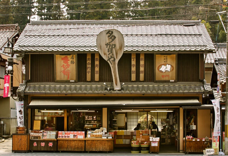 近江鉄道多賀線・多賀大社前駅から徒歩10分ほどの、多賀大社門前にある「多賀や」。大きなしゃもじが目印の店舗は気軽に立ち寄れる雰囲気で、古き良き温かみを感じる店内では出来たての「糸切餅」が味わえます。米粉だけで作った餅で、自家製のこしあんを包み込み、細長く伸ばして糸で丁寧に切られた名物の「糸切餅」(10個850円、15個1,200円、20個1,500円)は多賀大社参拝のお土産にぴったりです。