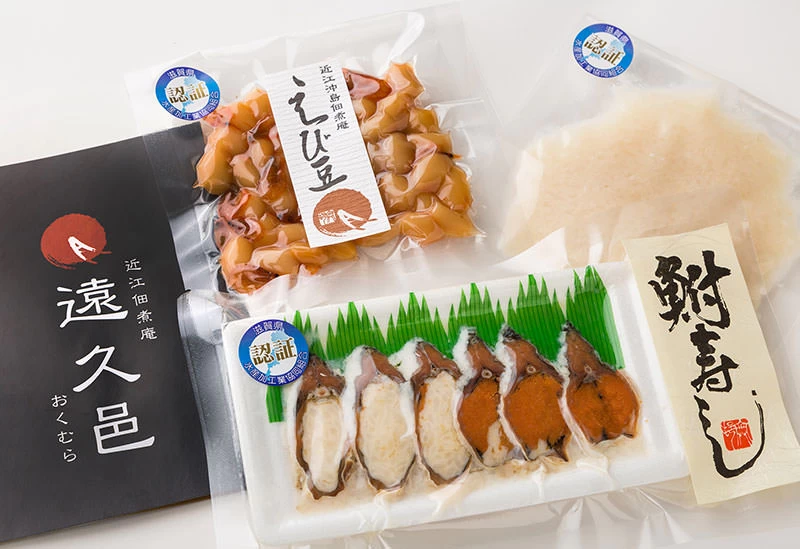琵琶湖・沖島で漁れた新鮮な湖魚を職人の確かな技術で加工する近江佃煮庵 遠久邑。滋賀県の名物、鮒寿司や佃煮、特産品の味付き赤こんにゃく(486円)や琵琶湖名産 えび豆(475円)などを取り扱っています。yoshio fermented foods 鮒寿し×つやこフロマージュ 5,940円はニゴロブナ・チーズ・飯、それぞれに相乗効果を与えた、鮒寿しの様で鮒寿しでなく、チーズの様でチーズでない新感覚の逸品。こだわりの滋賀のお土産にいかがでしょう。