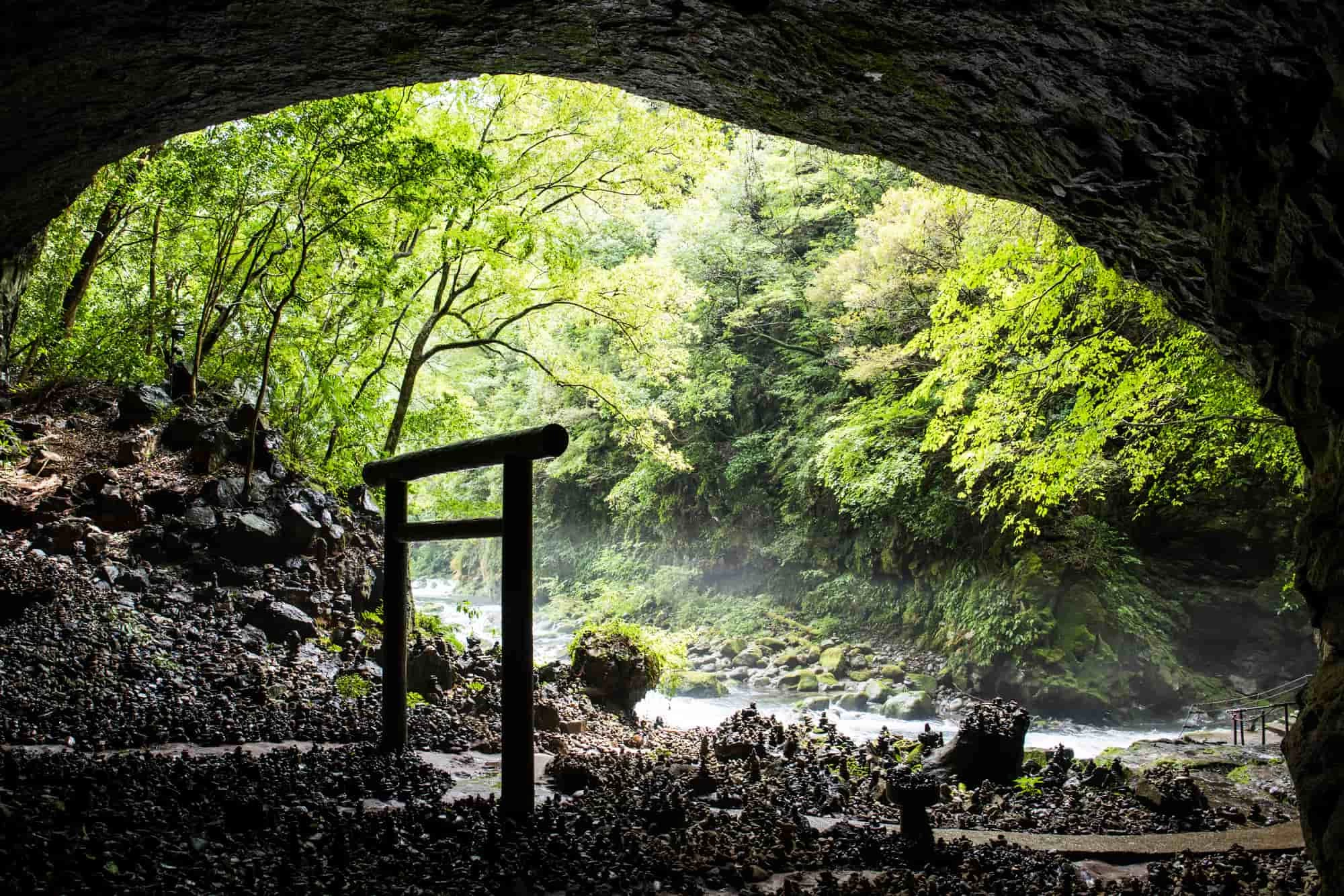 天岩戸神社の西本宮から、岩戸川を500mほど進んだ先にある、天安河原(あまのやすかわら)。ぽっかりと穴の空いた洞窟は、天照大御神が天岩戸にお隠れになり天地暗黒となったために、困った八百万(やおよろず)の神が集まり相談したと伝わる場所で、鳥居と社殿が設けられています。あたりには、訪れた人々が願いを込めて積んだ積み石が置かれており、いかにも神秘的な雰囲気。高千穂が「神話のふるさと」であることを再認識できるスポットです。