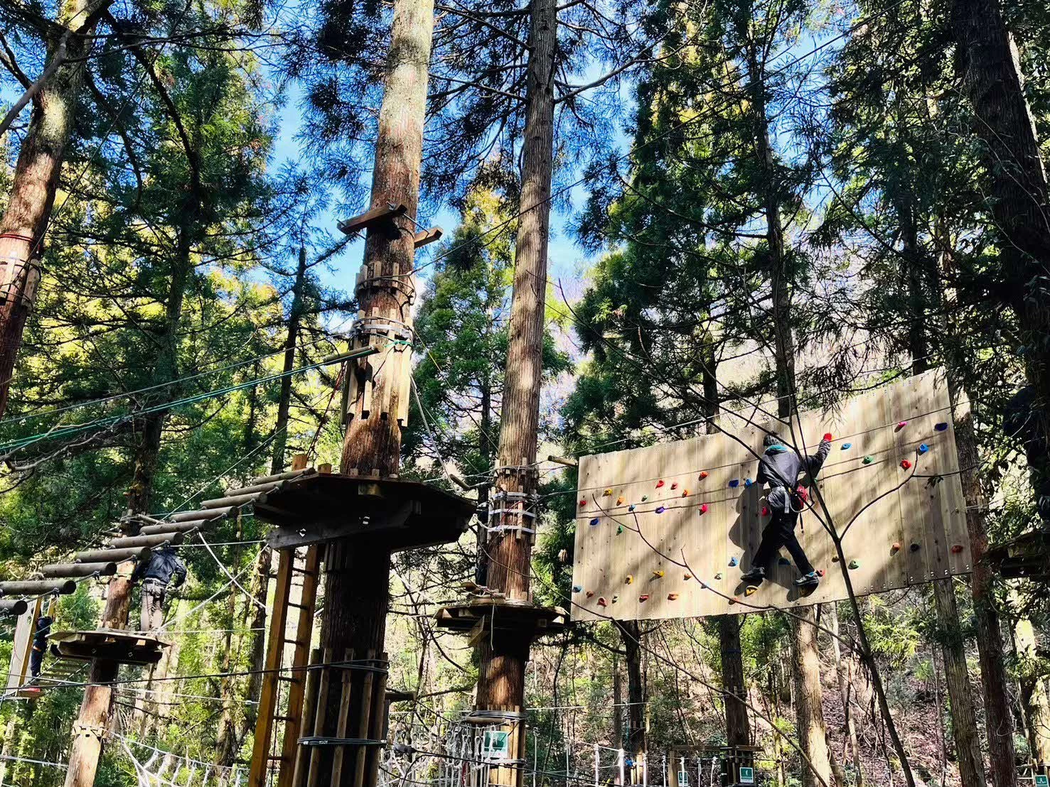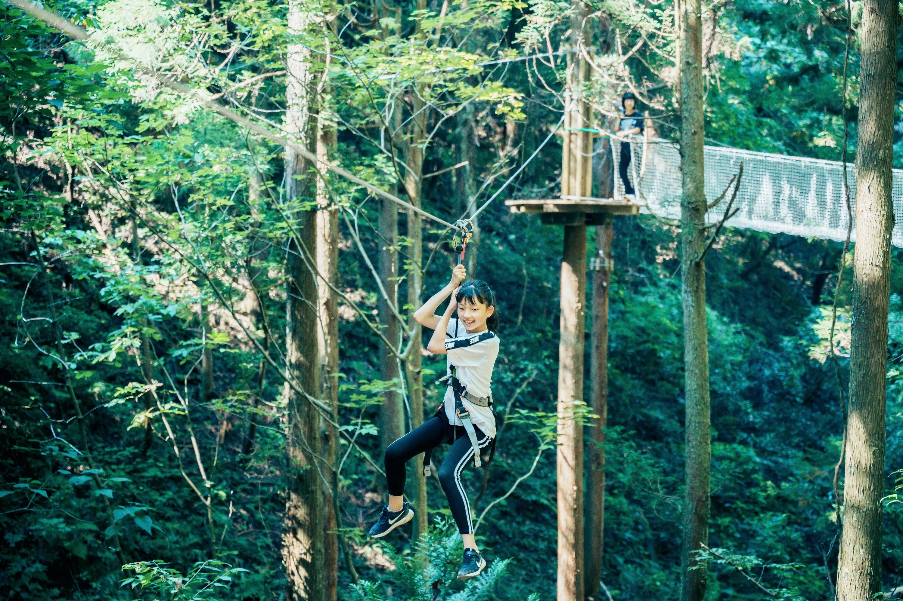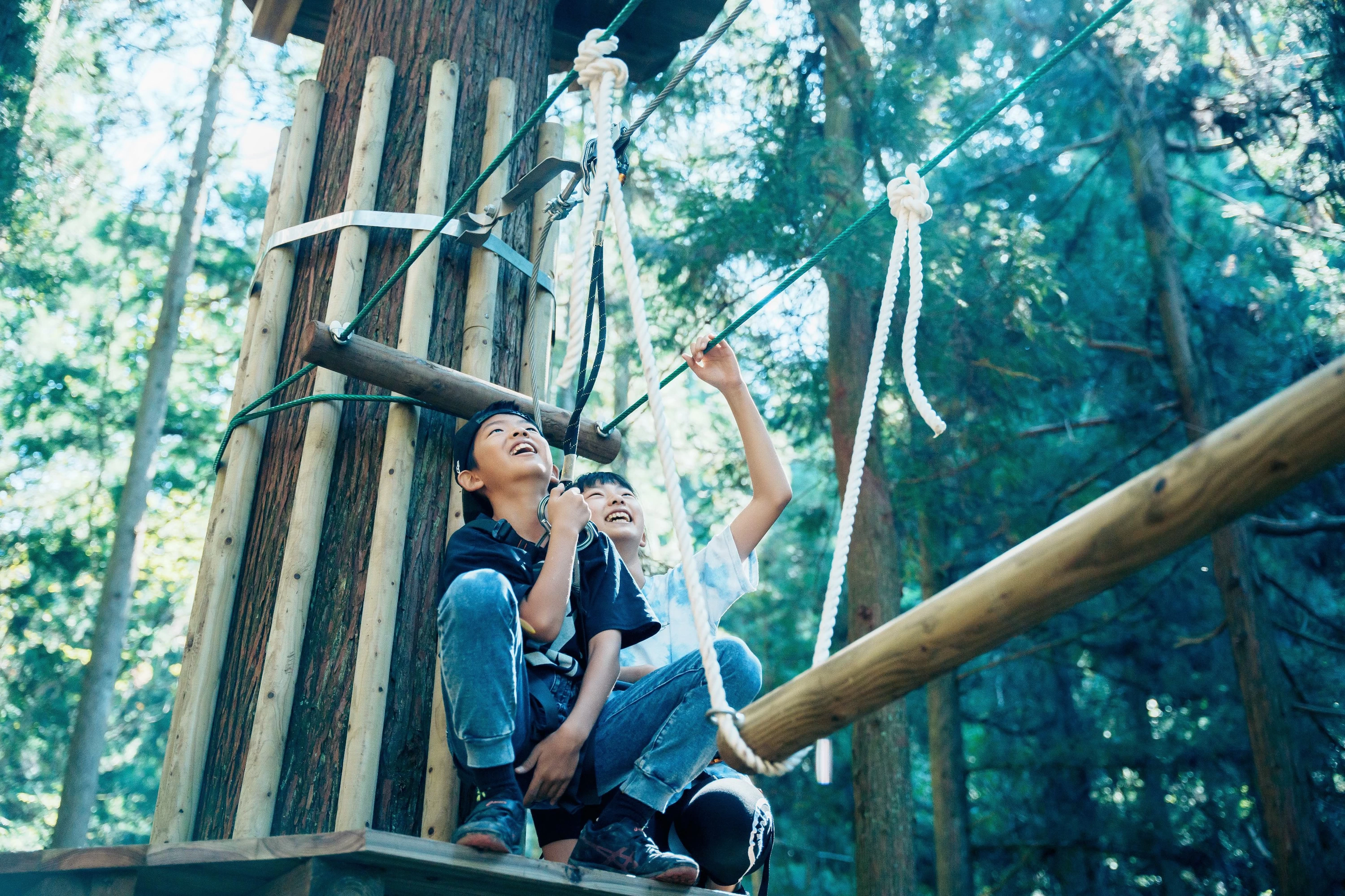 森林の地形や樹木をそのまま活かした、多彩なアクティビティが楽しめるフィールドアスレチック。樹上10m以上の高さから滑り降りる爽快感が人気のジップラインをはじめ、バランス感覚を試されるアクティビティが設けられ、全身を使って挑戦できます。年齢・身長、レベルに応じて「チャレンジコース」「アドベンチャーコース」「サバイバルコース」の3コースが用意されています。思いきり体を動かしたあとは、併設のバーベキュー場でお腹を満たすのもおすすめ。家族や気の合う仲間と、大自然のなかでアウトドアを満喫しましょう。