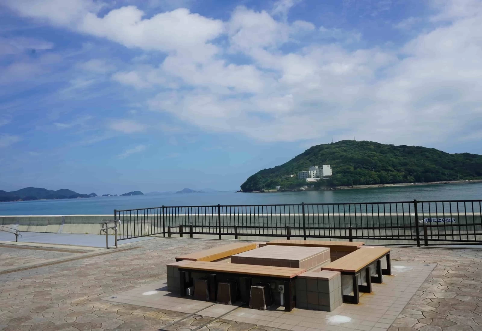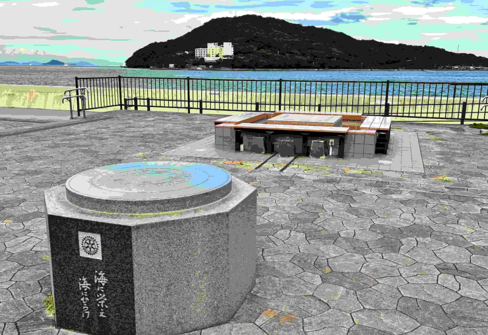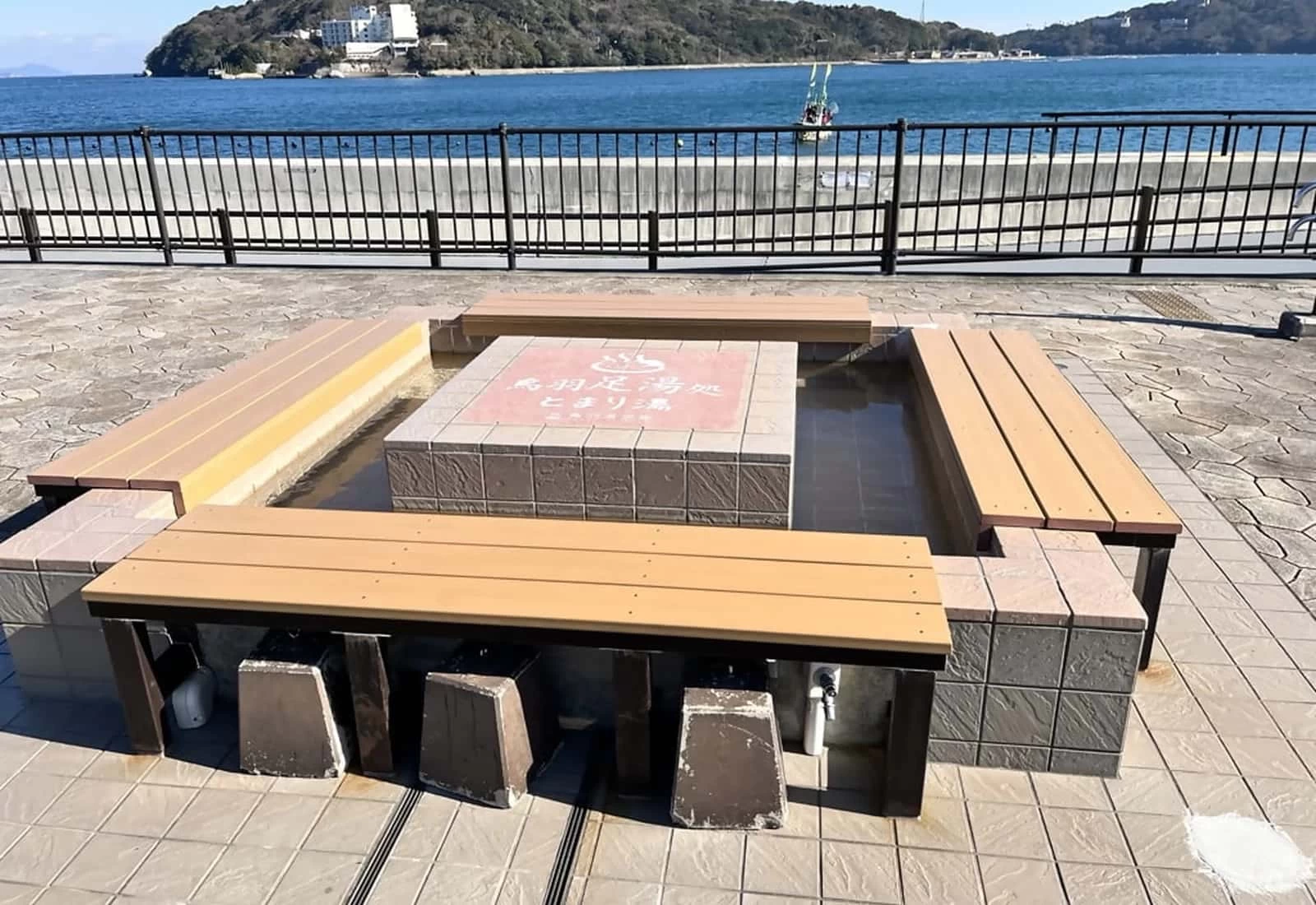 佐田浜東公園内にある、塩化物泉の足湯で旅の疲れを癒やせる「鳥羽足湯処 とまり湯」。12席ほどの椅子が備わっており、鳥羽湾を行き交う船やカモメを眺めながらゆったりとした時間を過ごせます。