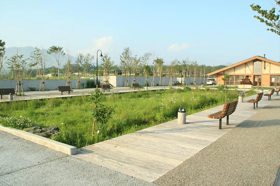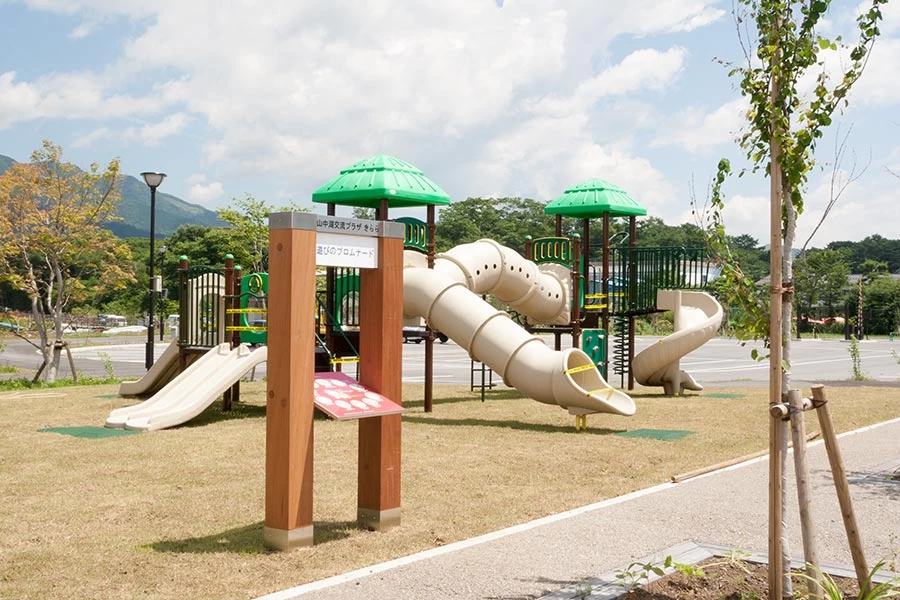 劇場施設のシアターひびきや、アクティビティエリアの原っぱや広っぱがある山中湖交流プラザきらら。自然公園には、水のプロムナードや遊びのプロムナードなどがあり、軽い運動や散歩にぴったりです。春はフクジュソウ、夏はエゾミソハギ、秋はフジバカマ、冬はオニグルミが見られ、どの時期もベストシーズンといえます。野外フェスの会場に利用されるほか、ヨガ・エクササイズ・ウクレレの体験教室も開かれるなど、アクティビティスポットとしても人気です。