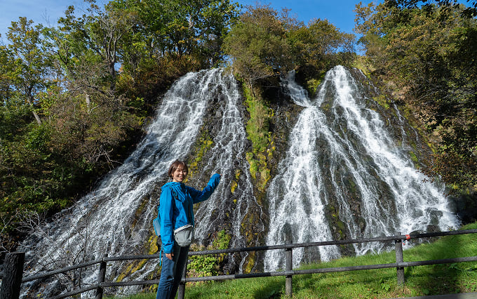 北海道斜里郡斜里町ウトロ西、チャラッセナイ川の河口近くにかかる名瀑。落差は約30メートルで、滝の途中で流れが二筋に分かれることから「双美の滝」とも呼ばれています。日本の滝100選・知床八景の一つに選ばれており、駐車場から滝の中段まで階段で近づくことができます。