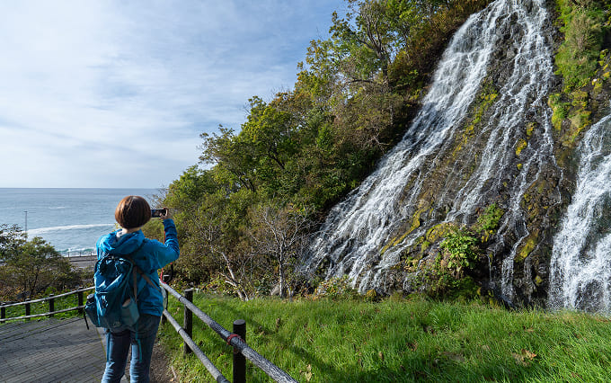 知床連山の地下水が断崖の割れ目から海へと染み落ちる特徴的な滝で、その流れの繊細さから別名「乙女の涙」とも呼ばれています。知床自然センターから往復約2km、遊歩道を20分ほど歩いたところにある展望台からは、断崖絶壁、オホーツク海、知床連山を一望できます。