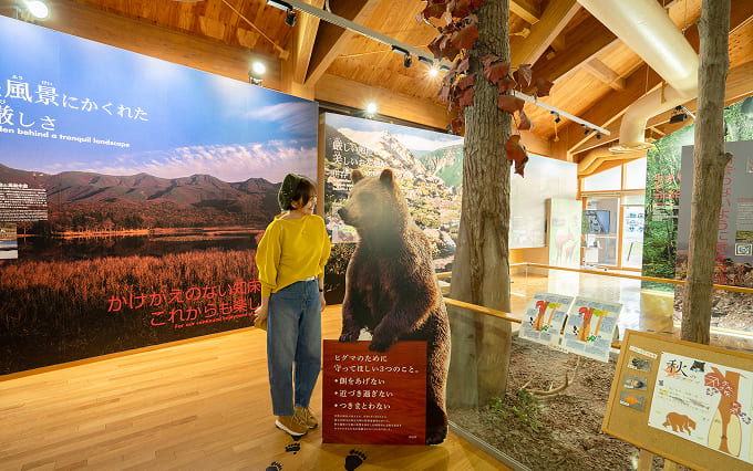 - ヒグマ、エゾシカなど知床に生きる動物の実物大写真や、地形・生態系を描いた大型パネルを通じて、知床の自然を直感的に理解できる展示。訪問者は視覚的インパクトで知床の多様性を体感することができる。