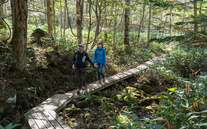 知床五湖の散策は、「高架木道」と「地上遊歩道」があり、森の中を巡る地上遊歩道ルートでは、五湖すべてまたは主要湖を巡ることが可能。ルートには大ループ(全長約3km、ガイドツアーで約3時間)と小ループ(約1.6 km、約1.5時間程度) の2つがあります。