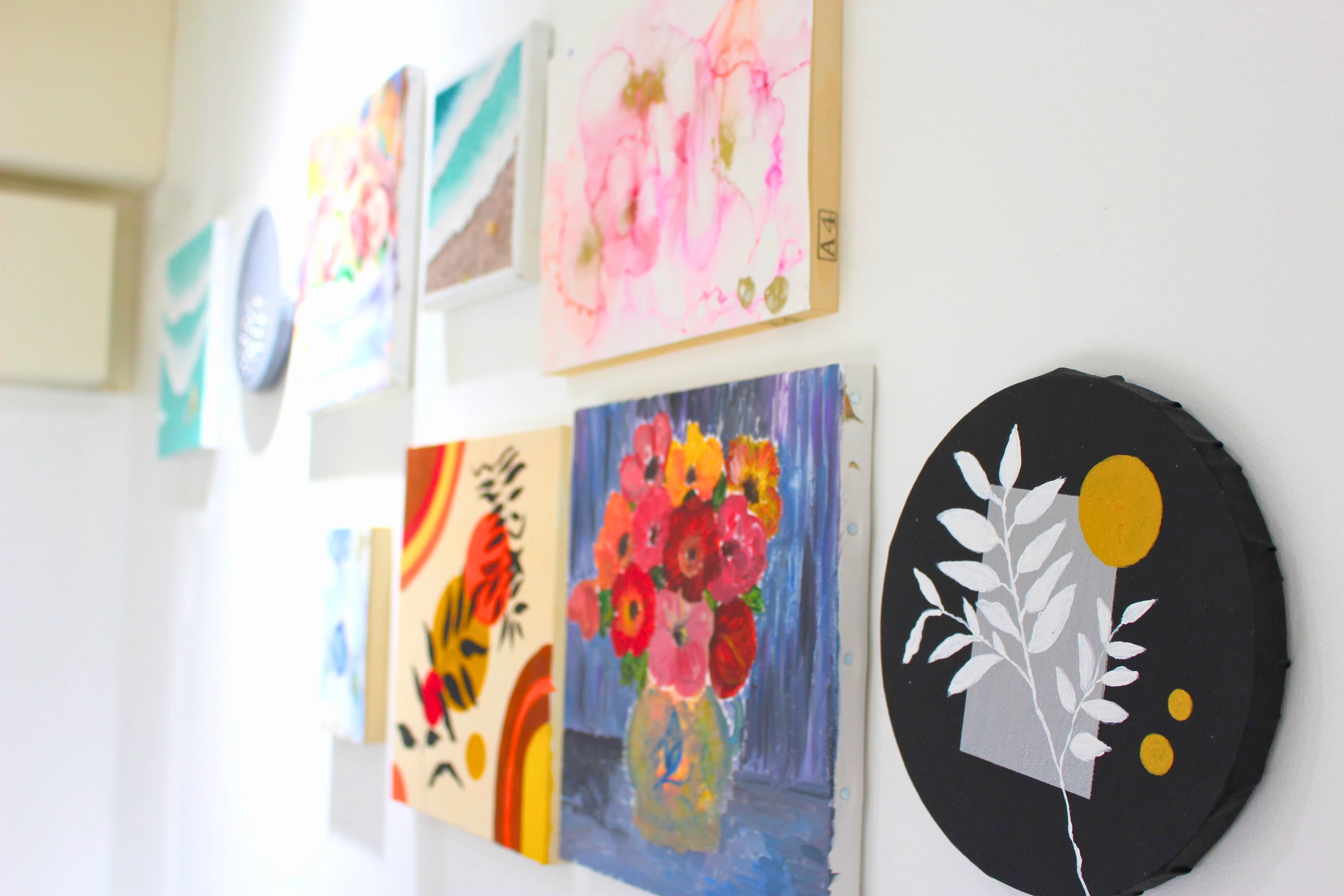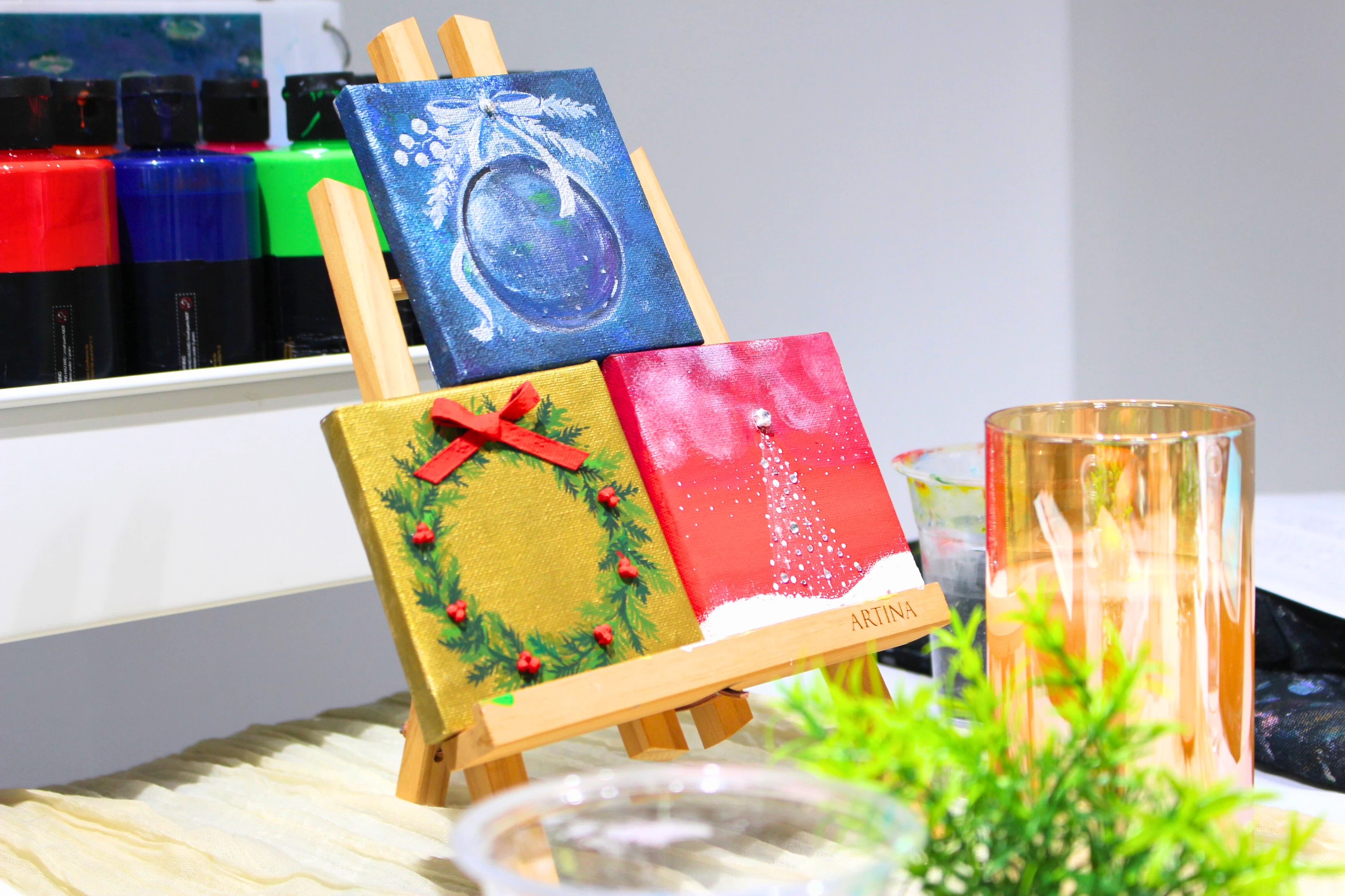 店内に入ると、まず目に入ったのが壁にずらりと並ぶさまざまなアート作品。訪れた日はクリスマス間近だったので、テーブルの上にはツリーやリースが描かれた作品もあり、店内全体がとてもかわいらしい空間でした。
