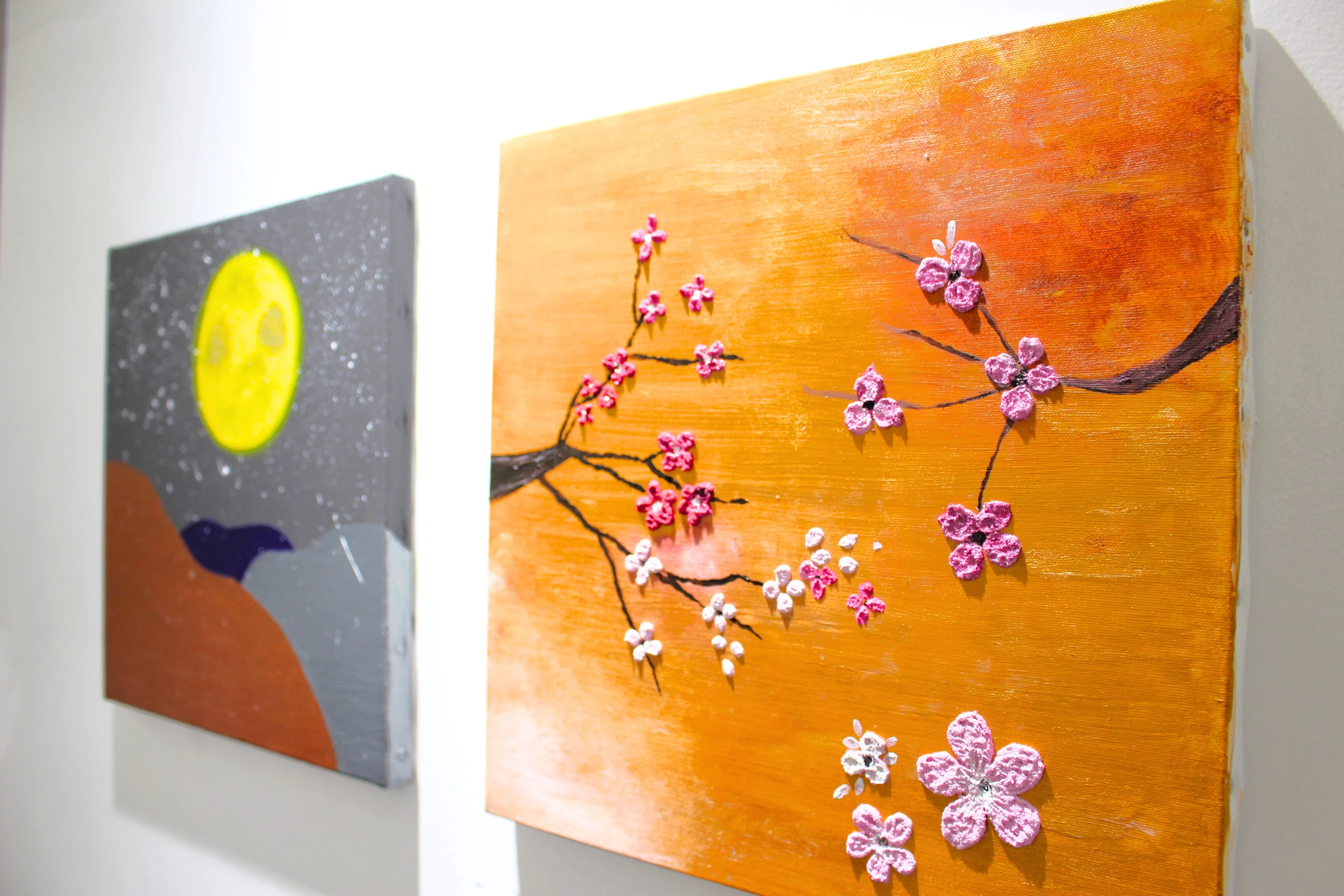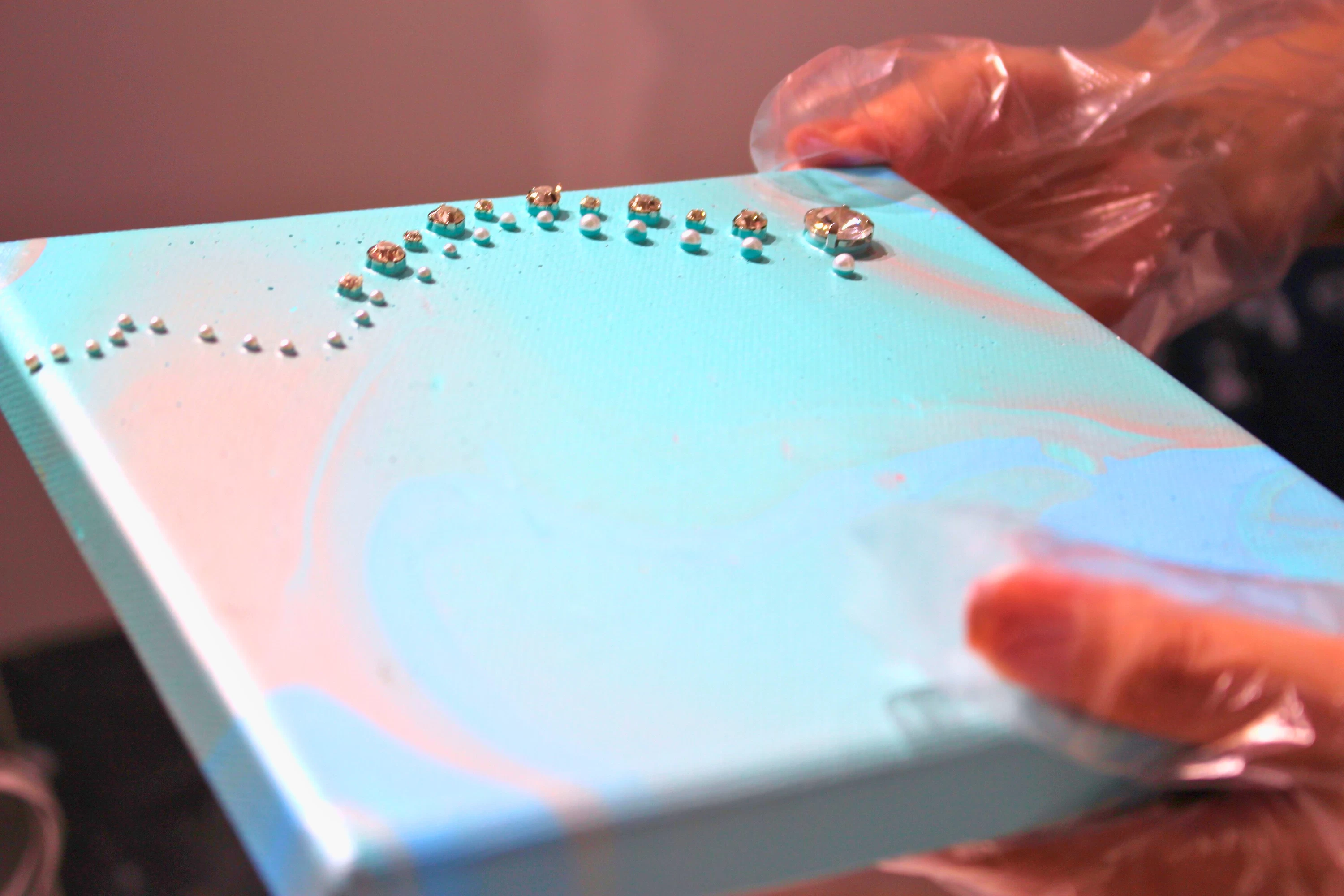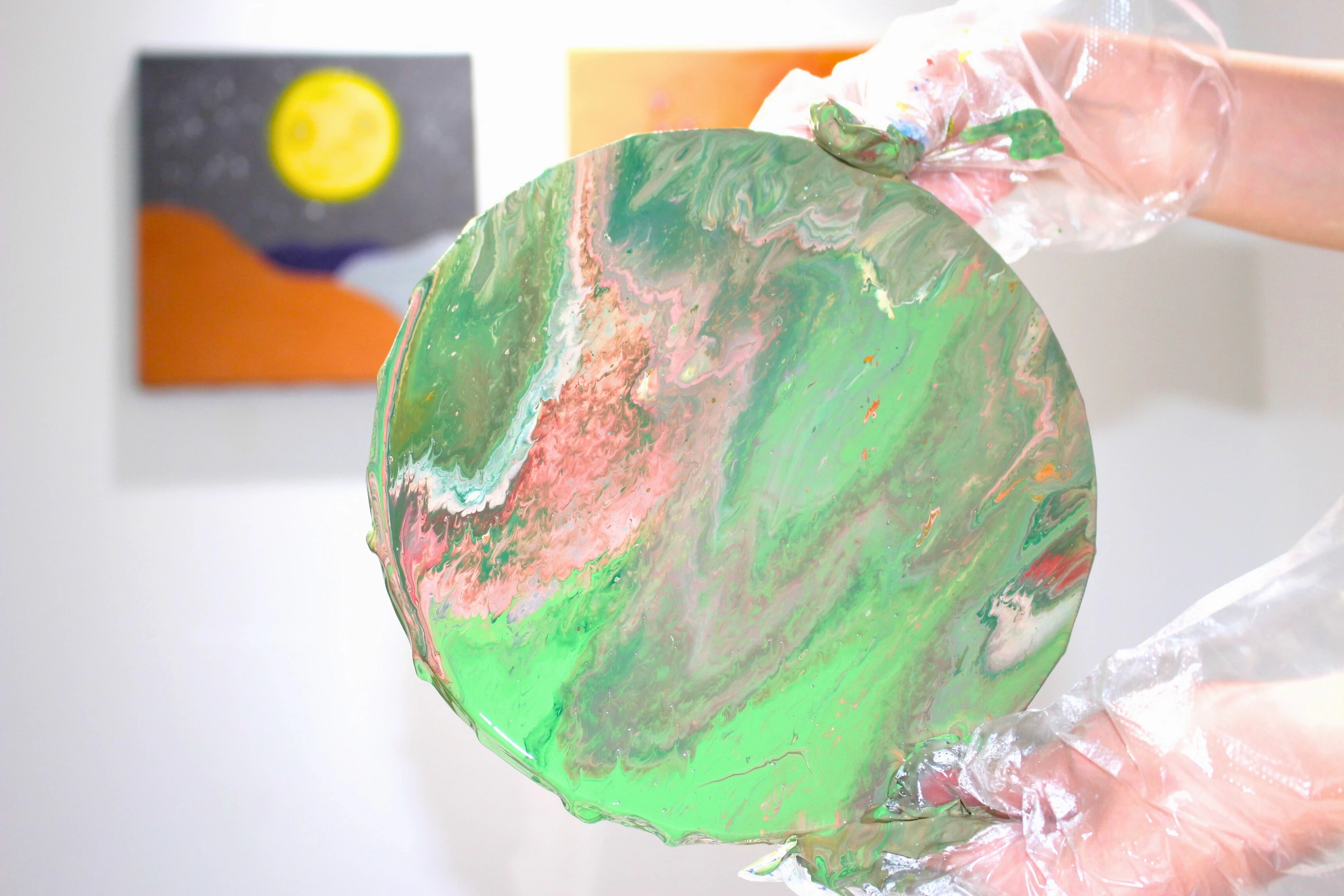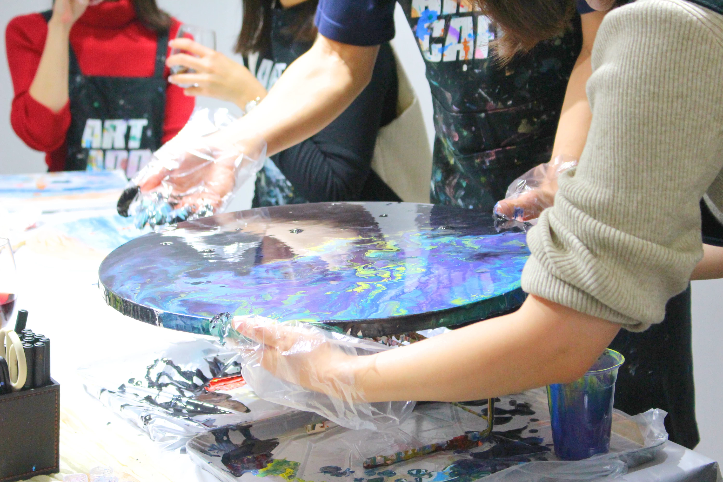 続いて体験したのは、SNSで話題のたらし込みアート。アクリル絵の具をキャンバスに垂らし、水や重力を使って偶然できる模様や色のグラデーションが広がるアート技法です。自然に生まれる美しさが魅力で、絵の経験がなくても気軽に楽しめるワークショップとして人気があります。