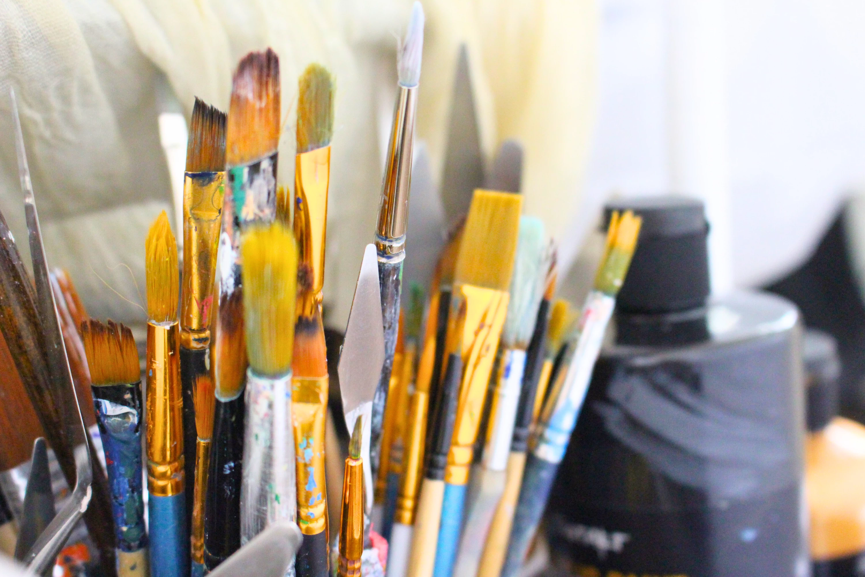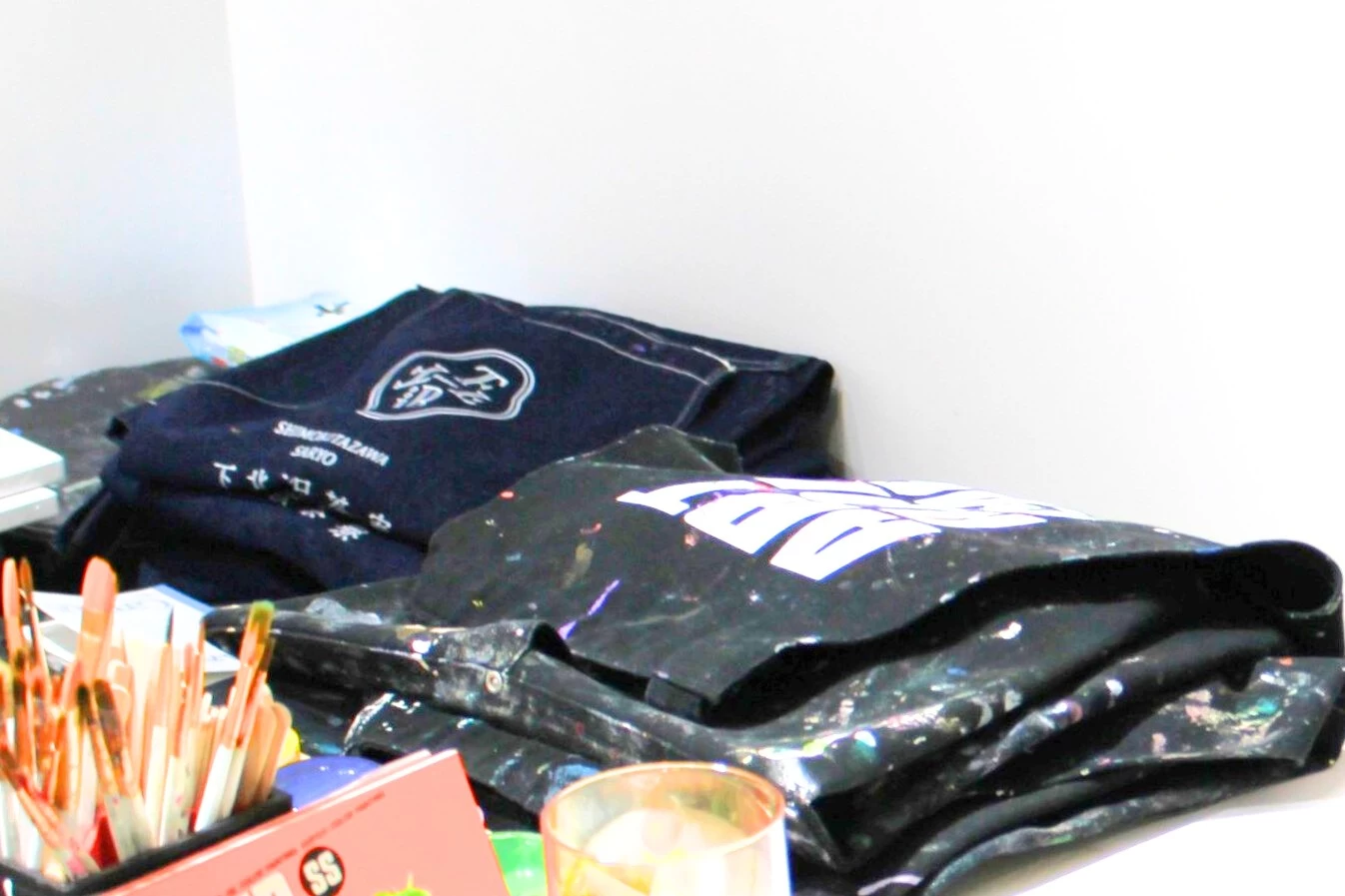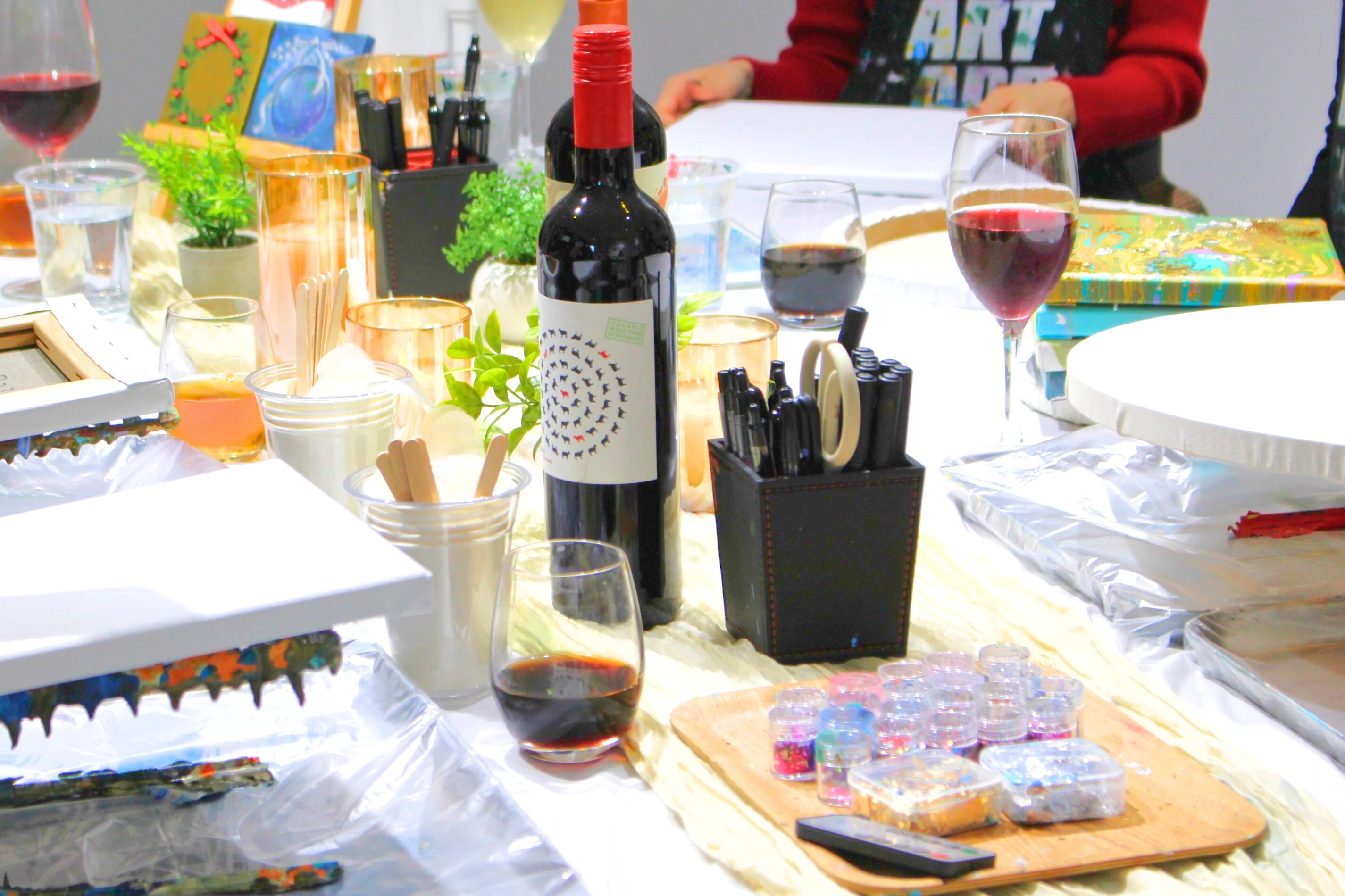 お酒を飲みながらアートを楽しむスタイルなので、ワインの提供もあります。最初にワインで乾杯することで緊張感がやわらぎ、肩の力を抜いてアート体験ができるのが印象的でした。テーブルには絵の具や筆などの画材があらかじめ揃っており、エプロンも用意されているため、手ぶらで参加できます。
